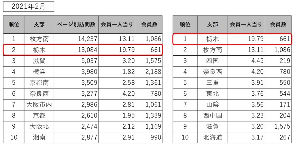 支部別HPアクセス数の評価基準が全てのページを訪問した数「ページ別訪問数」と「会員一人当たりのページ別訪問数」で評価することになりましたが、2021年2月度は「会員一人当たりのページ別訪問数」が19.79でした。2020年4月から2021年2月まで連続11ヶ月全国1位となりました。この記録はひとえに多くの会員の皆様が支部HPにアクセスして頂けた結果であります。ここに改めて御礼申し上げます。