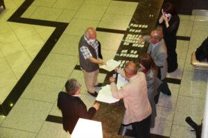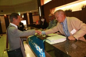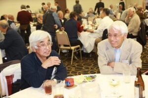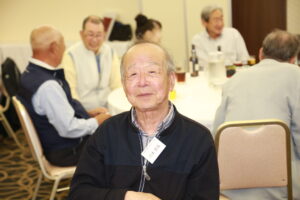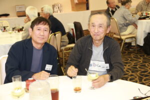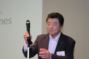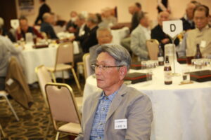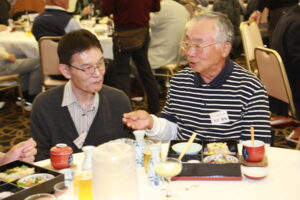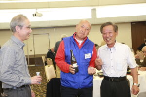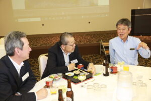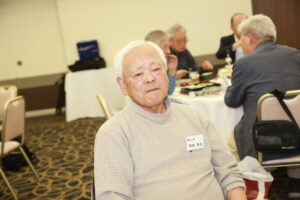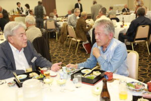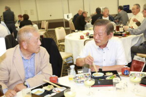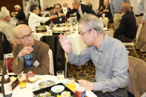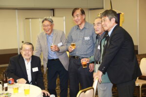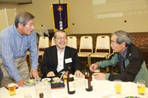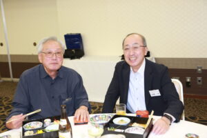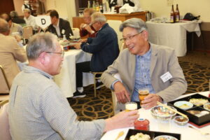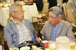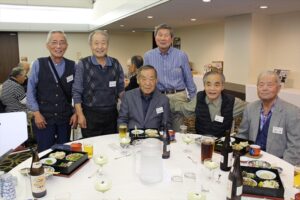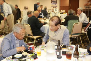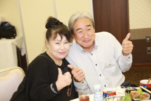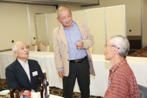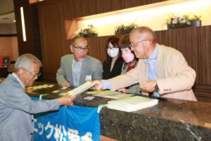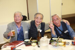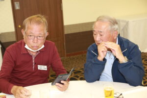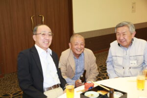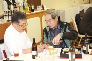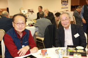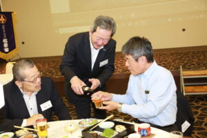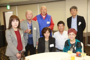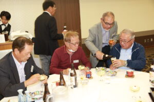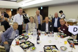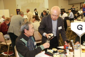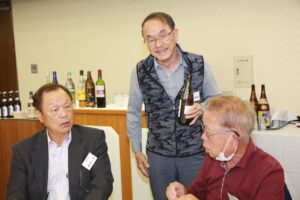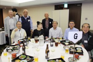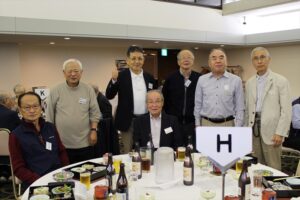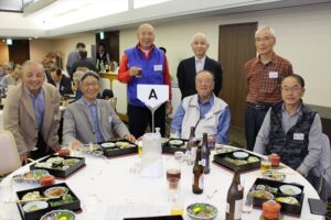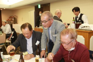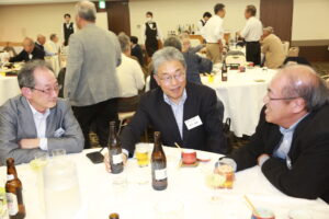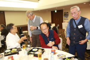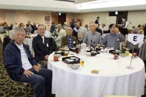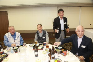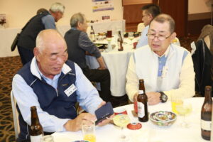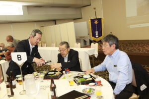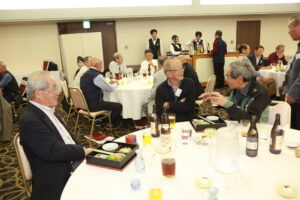 北垣支部長の挨拶と新役員の小林信一さんの紹介をいただき小林新役員から自己紹介をいただきました。お待ちかねの懇親会の幕開けの乾杯の音頭を歴代支部長の山本さんに急遽していただきました。久しぶりの再会で各テーブル毎に交流を深めておられました。また、会食の途中に2025年大阪・関西万博にパナソニックグループとして出展するパビリオン「ノモの国」のビデオ放映をさせて頂きました。最後に社会貢献活動のみんなで”AKARI“アクションの取り組みでは古本・ディスク募金を呼び掛けておりましたところ支部大会時に持参いただいたほかに会場に募金箱を置いてワンコイン募金の協力も求めました。ご協力に感謝を申し上げます。皆様、お疲れさまでした。会場受付にて本・CD・ハガキ・テレホンカード・切手等のご寄付をいただき、ありがとうございました。