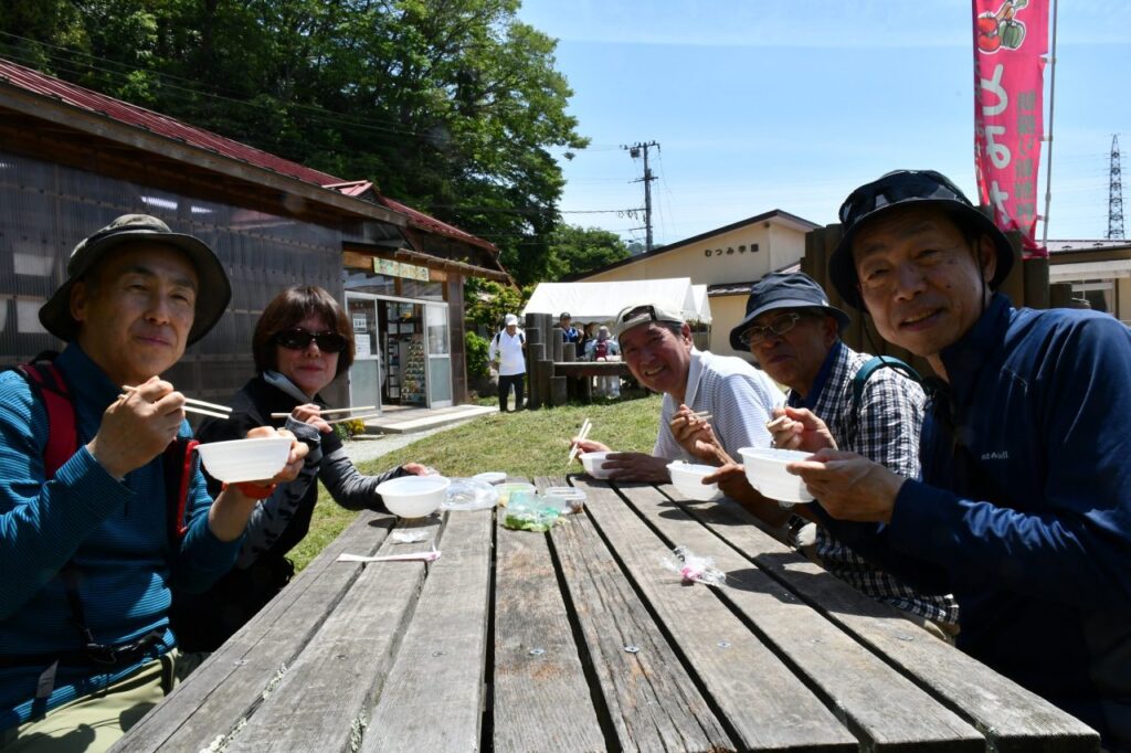 田植え真っ最中の田園風景を見ながら、第1休憩所で、お餅のサービスを受け