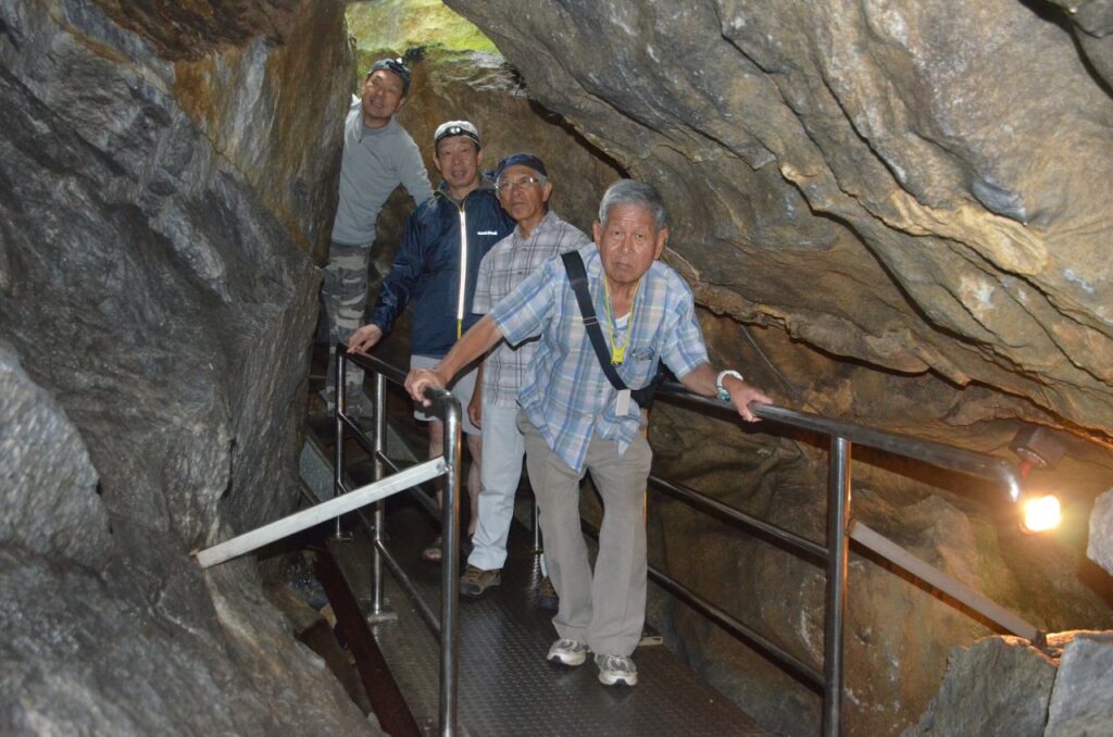 最大の難関、『胎内くぐり』では、鍾乳石の隙間がくぐれず、右足を出したり、左足を出したり、上半身をねじったりで、5分以上奮闘し通過した人も(笑)。股関節が硬くなる60代には予想以上の難コース!