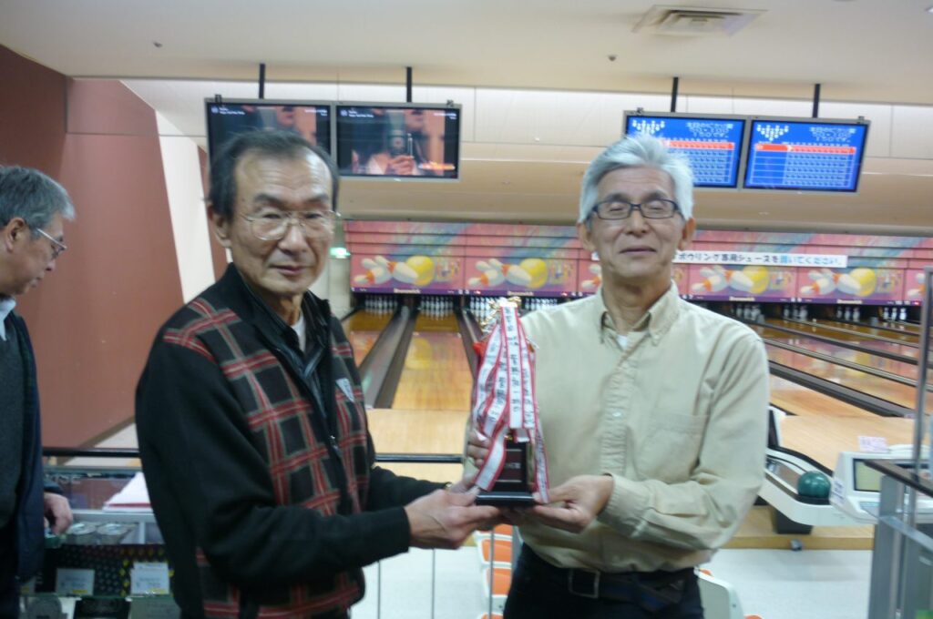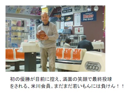 参加者は9名と少なかったです。身体の調子が今一つというメンバーの方々がおられ心配をしております。。。 しかし少人数でも、いざ投球がスタートすると、年齢を吹き飛ばすがの如く熱を入れた投球が各レーンで見受けられ、その中でも、参加中の最高齢である、米川会員の元気はつらつ姿が特に目立ち、足腰を心配していましたが、なんのその、そのまま栄えある優勝という栄冠を勝ち取られました!!。
