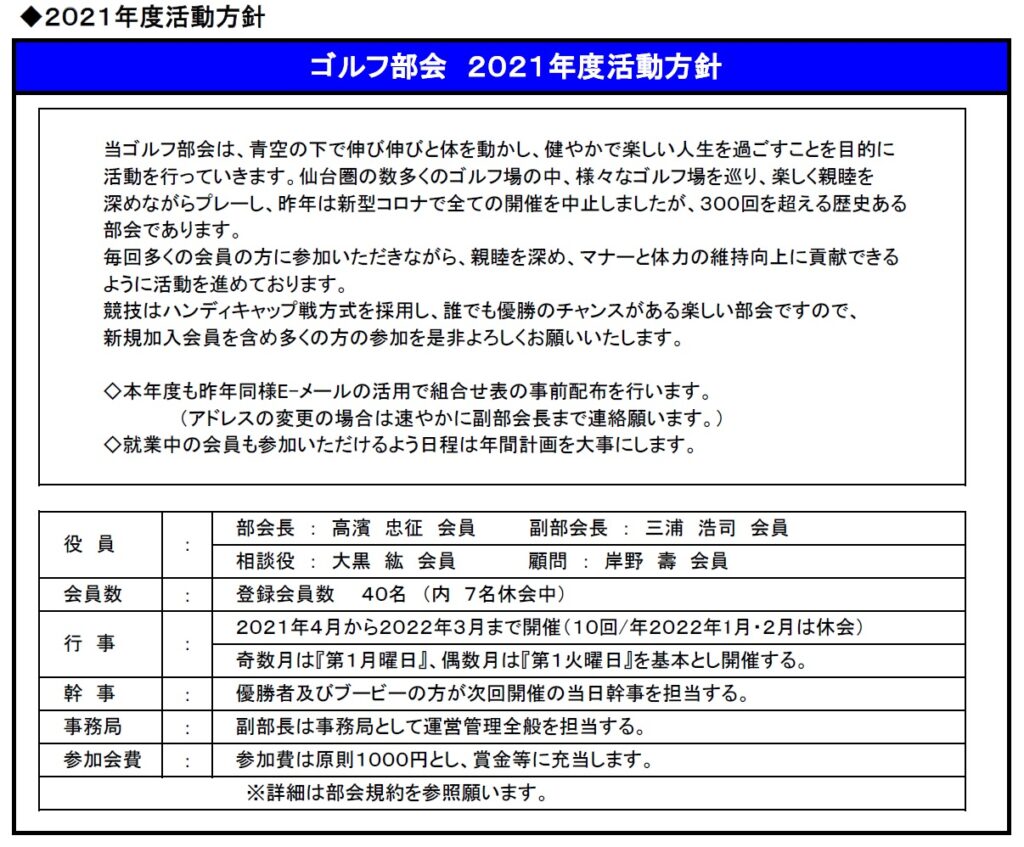 | 4月 | 6日(火) | (泉区)仙台ヒルズゴルフ倶楽部 | 有志 |