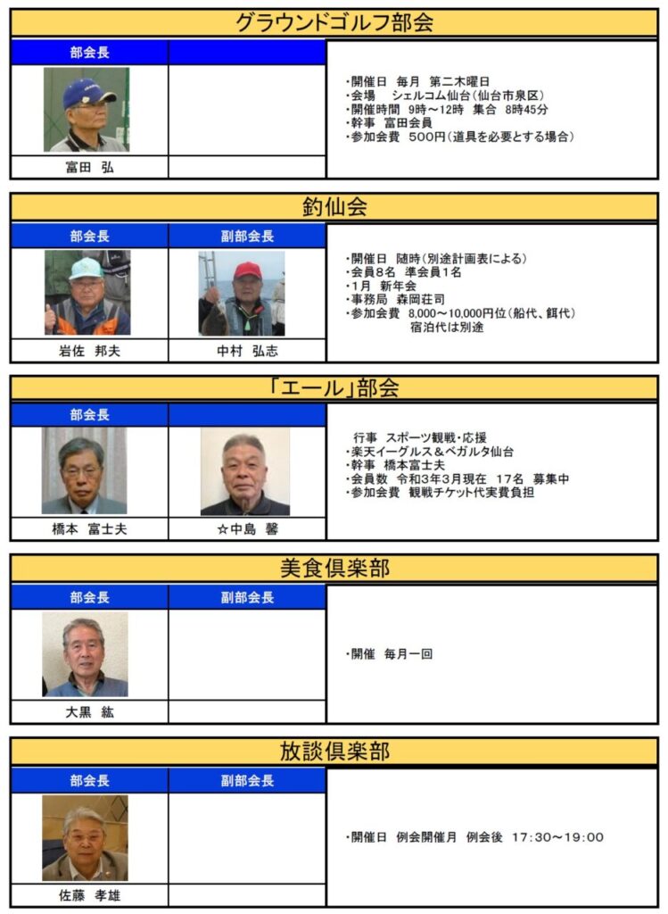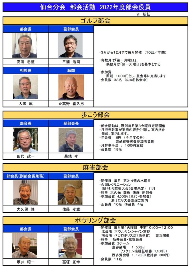 2022.05.1 仙台部会, 仙台部会活動方針・計画, 支部・分会役員紹介, 支部活動, 部会活動 仙台 部会活動 2022年度部会役員紹介 仙台分会 2022年度各部会役員一覧 支部大会での承認前ですが既に部会活動が開催されておりますので紹介いたします。 各部会の活動方針・活動計画一覧へのリンクは下記部会名をクリックすると移動いたします。 ◆ゴルフ部会 ◆歩こう部会 ◆麻雀部会 ◆ボウリング部会 ◆グランドゴルフ部会 ◆釣仙会 ◆「エール」部会 投稿者: 林﨑 仙台部会, 仙台部会活動方針・計画, 支部・分会役員紹介, 支部活動, 部会活動 コメント: 0 北東北 「三陸に行ってきました」 2022.4.20前の記事 妖しい(詐欺)メールにご注意ください 2022.05.…次の記事