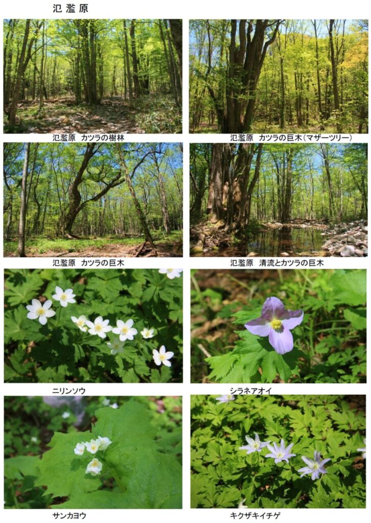 「氾濫原」は、大倉川の流れが創った石ころの河原広場で、その末端では伏流水となって川が消えてしまいます。その河原には清流とカツラの巨木が乱立し、その下にはニリンソウの群生やシラネアオイなど春の山野草が咲き乱れています。