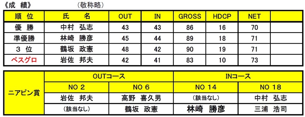 3位は惜しくもHCCPの差で鶴坂会員が入賞されました。成績はグロス90、ネット71の1アンダーでした。