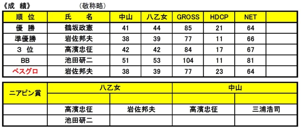 優勝は鶴坂会員。ご本人いわく昨年よりレッスンを受けていた成果もあり、NET8アンダーでの優勝です。準優勝は実力ナンバーワンンの岩佐会員がこちらもNET6アンダーでの獲得です。3位の高濱会員、4位の森岡会員までアンダーという素晴らしい上位争いが繰り広げられました。 ベスグロは実力者 岩佐会員でした。