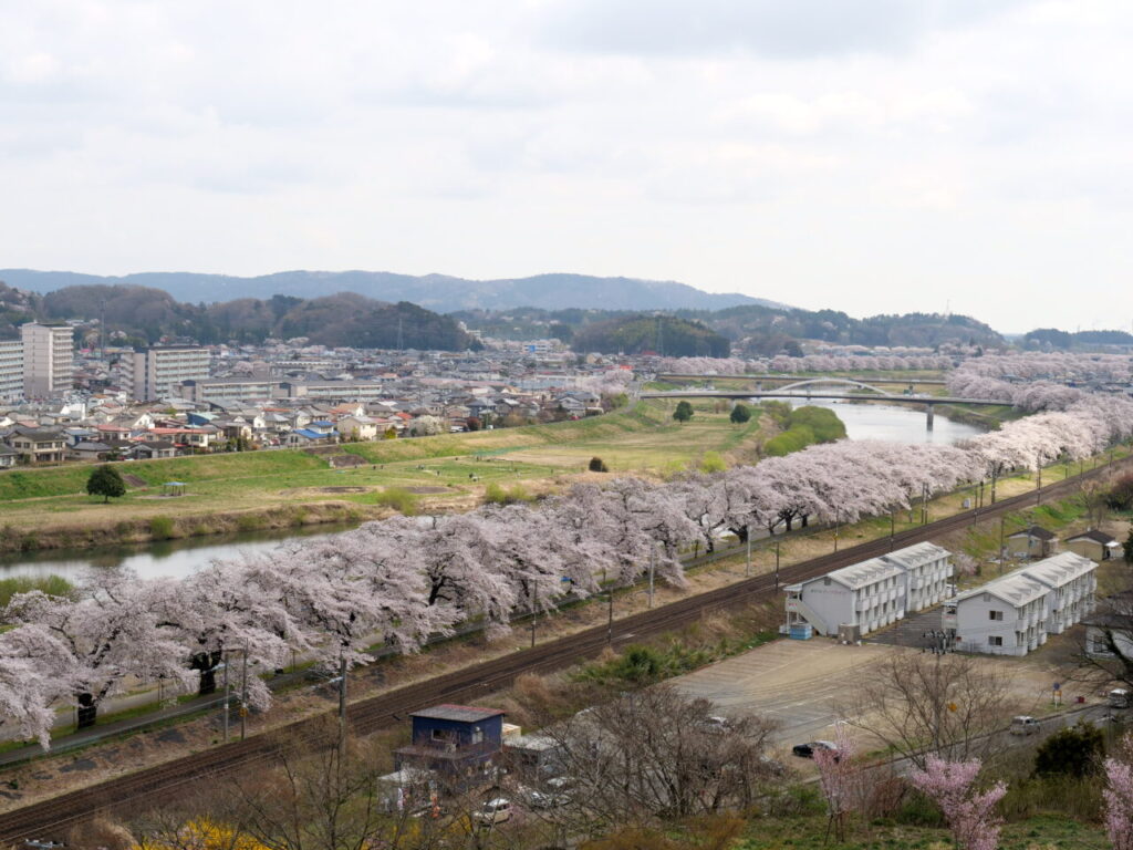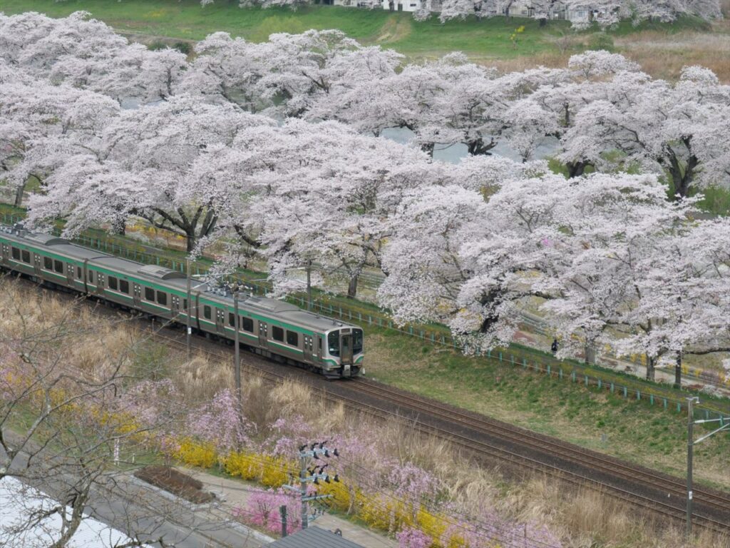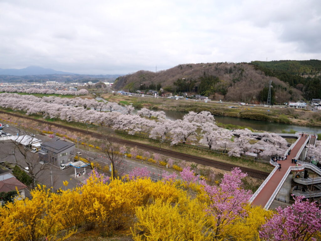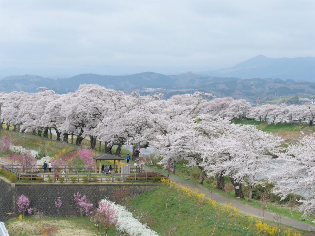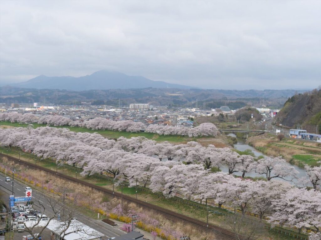 壮厳な蔵王連峰を背景に白石川堤に咲き乱れるソメイヨシノを中心とした桜並木、一目千本桜。