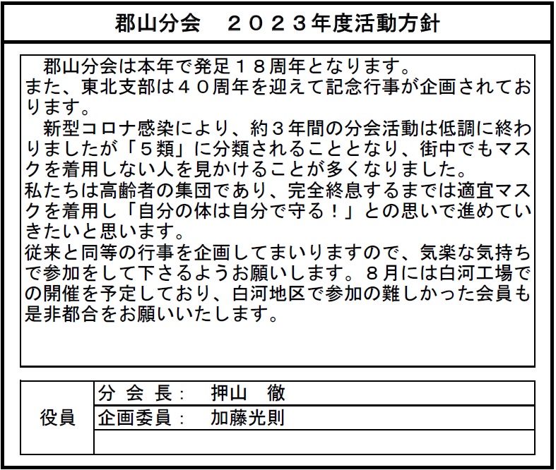 | 8月26日(土) | 郡山分会8月度例会 | パナソニック オートモティブシステムズ白河工場 |