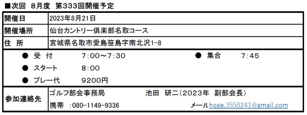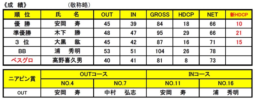 13名といつもより少ない参加でしたが、皆さん熱中症対策に心がけ全員無事に最終ホールアウトできました。