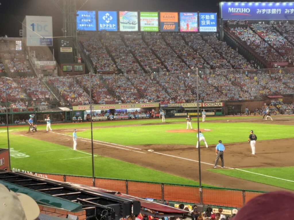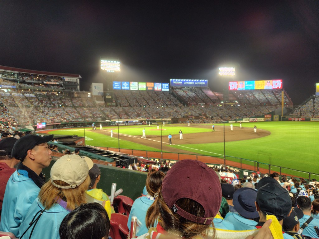 迷走台風10号(サンサン)の影響か、18時開始早々 急な夕立で試合が一時中断されました。その後は雨の心配はなく、本日も【県政だよりご優待チケット内野指定席1塁側A】(通常 9,100円)を 2,000円と格安で観戦することができました。