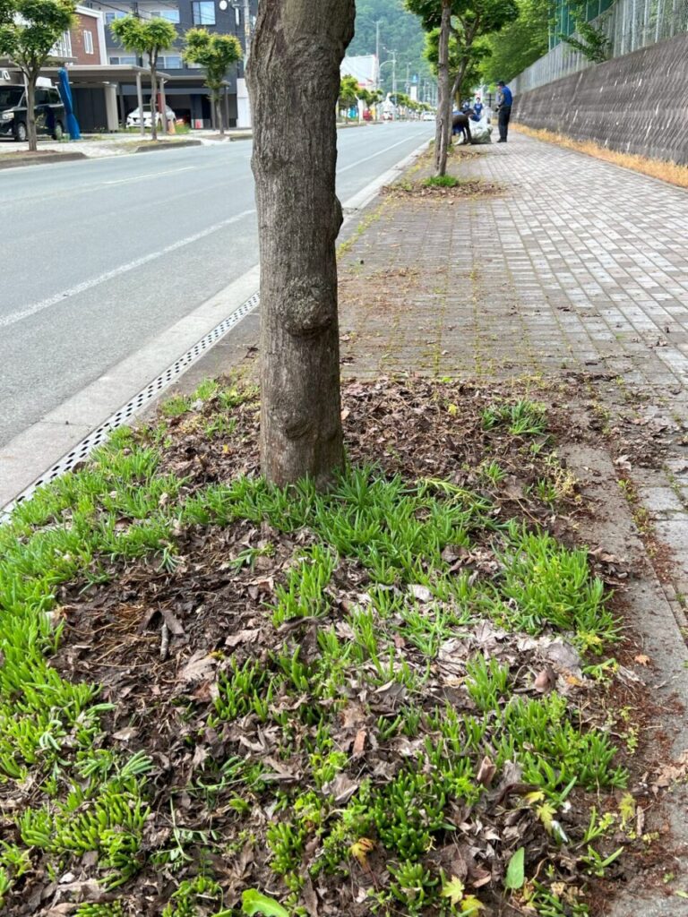 今回は、工場外周のゴミ拾いと工場西側の街路樹下のマツバギク花壇の草取りを行いました。