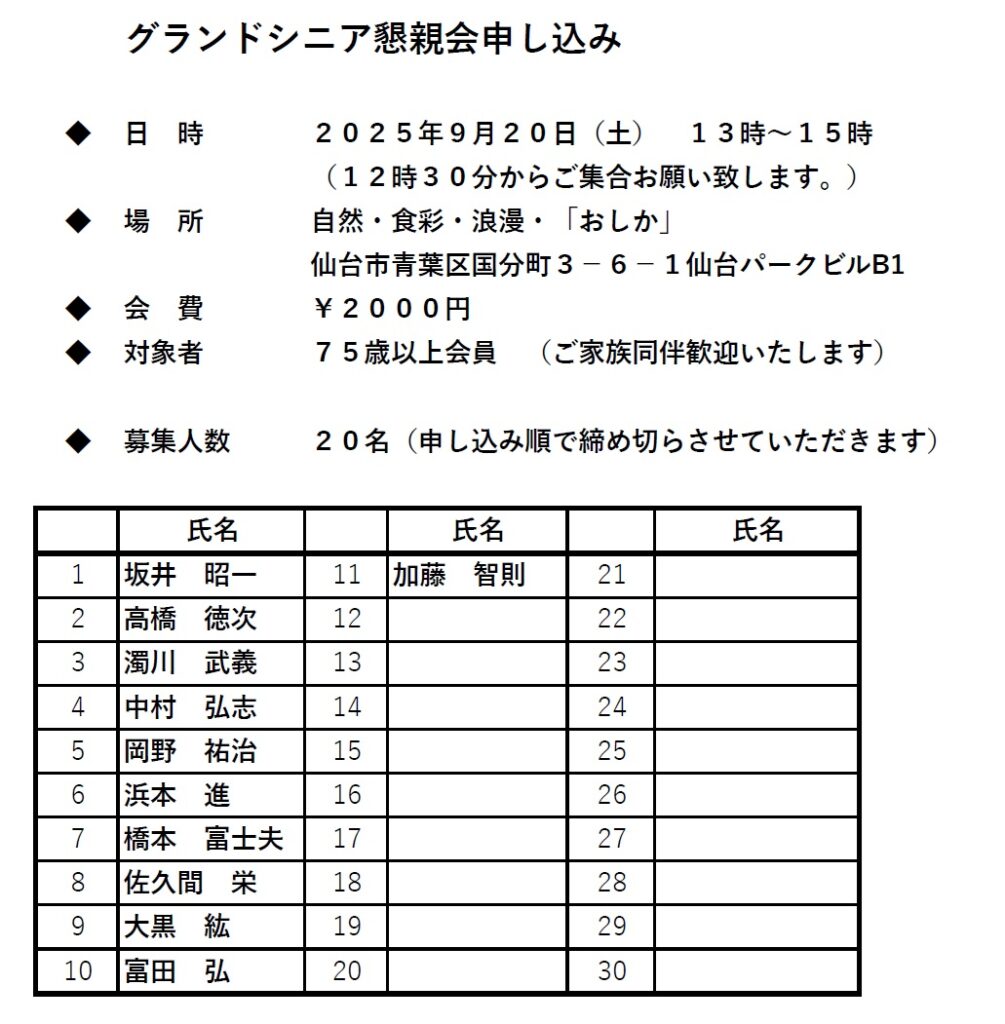 グランドシニア懇親会 参加申し込み締め切り迫る!!