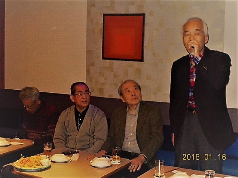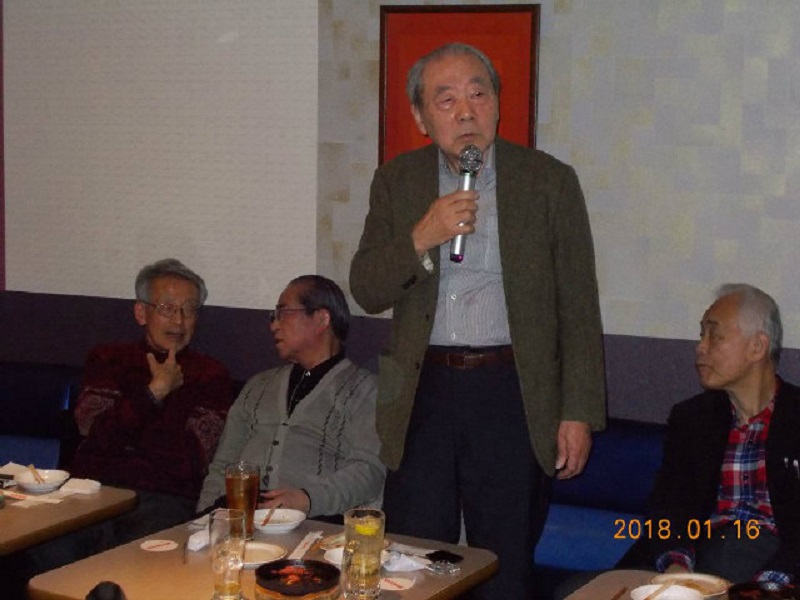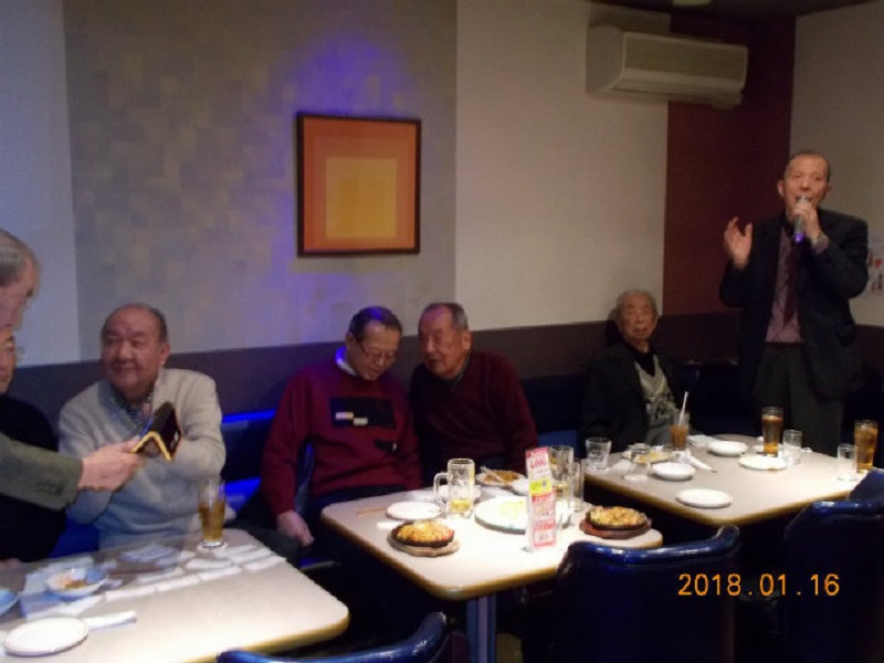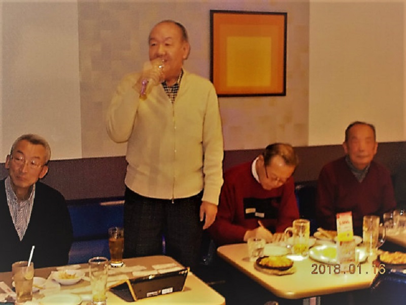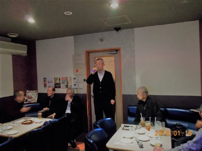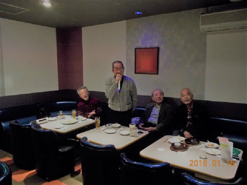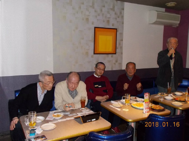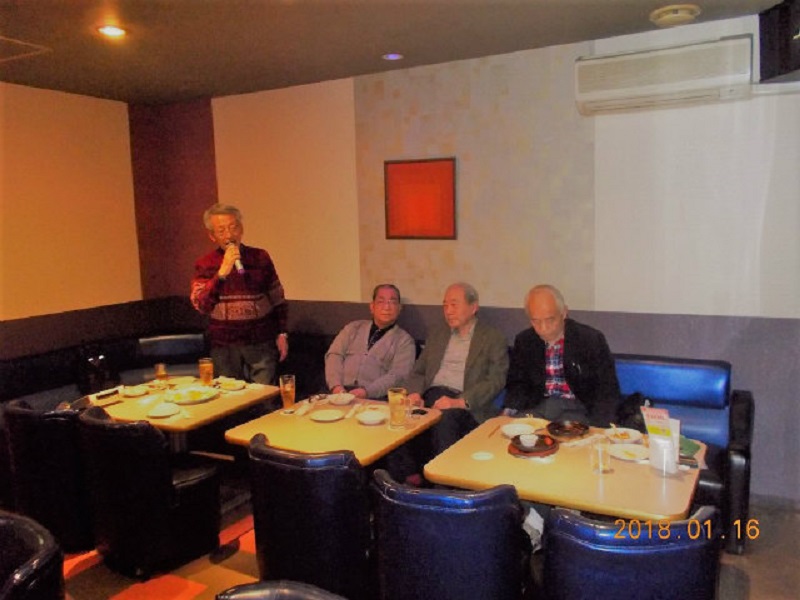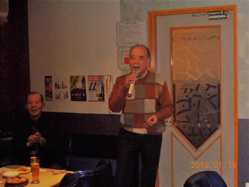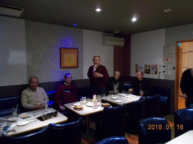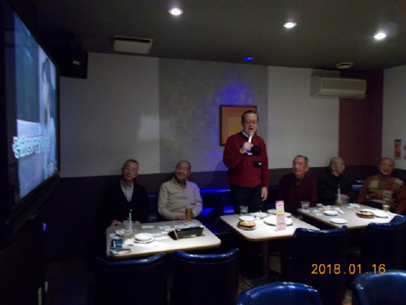 平成30年1月度例会を、16日第3火曜日正午から午後5時半まで、シダックス新宿歌舞伎町クラブで開催しました。厳寒の中比較的暖かな日に、13名が集い、語らい、唄い楽しい時を過ごしました。参加者(赤木、池田、市川、川上、酒井、笹岡、寒川、曽田、佐藤清、西村、福家、正岡、吉川)。終了後、数名が近隣の居酒屋「凛火」で懇親会を開催し、午後8時過ぎに散会しました。
