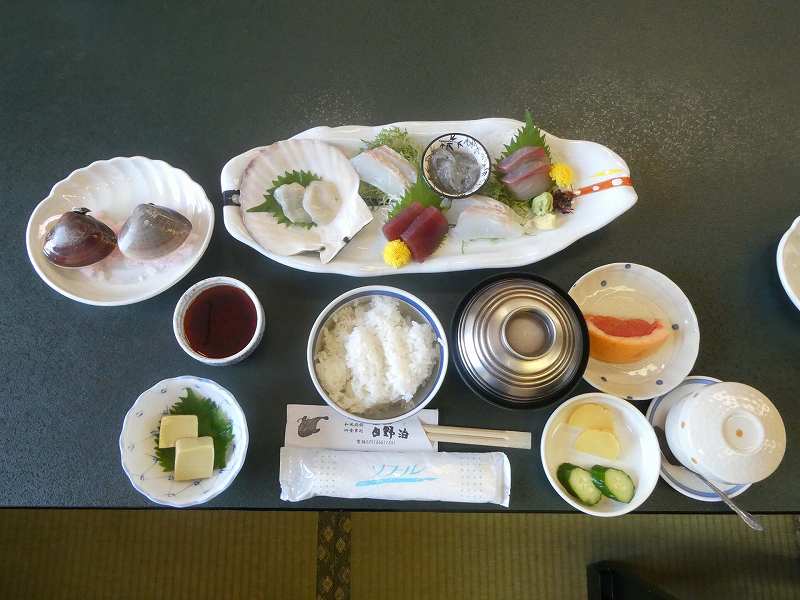 大洗ならではの魚料理(サシミ等)と焼きハマグリとサザエのツボ焼の2択からのメニューで堪能しました。(ビールなしで若干寂しかったですが) |