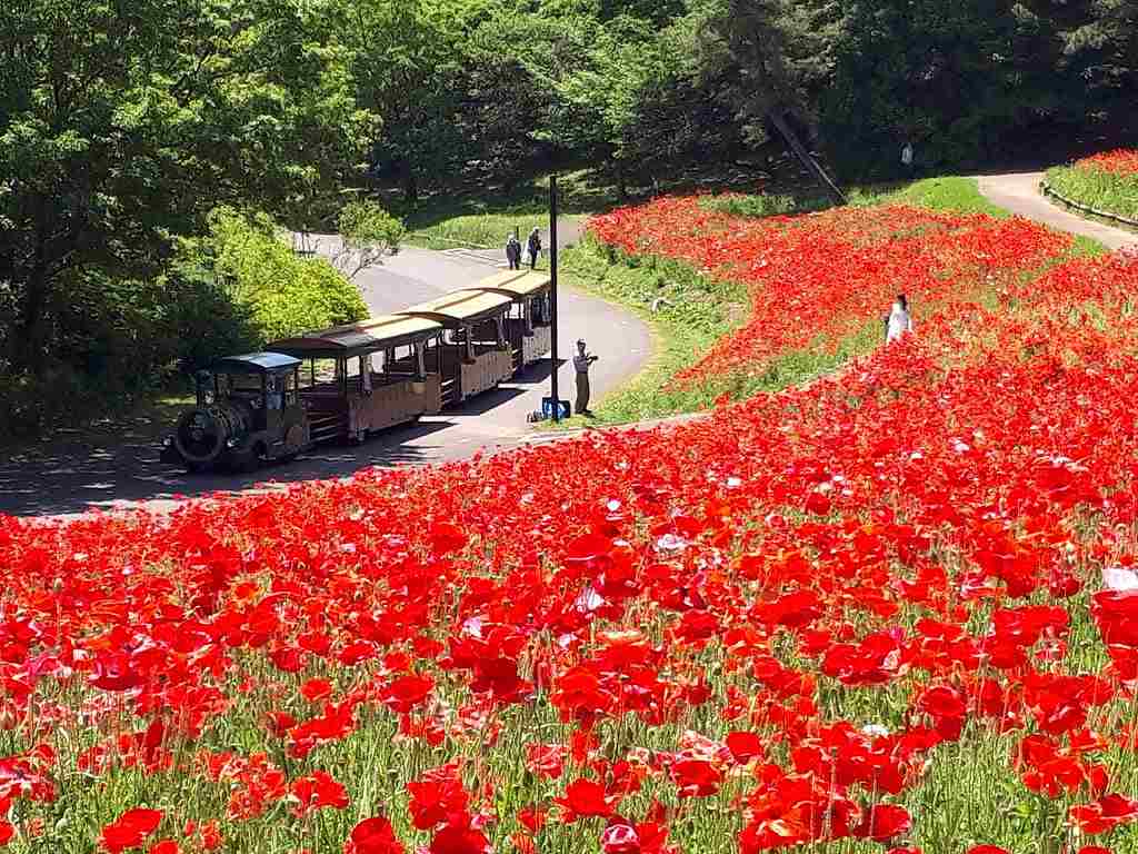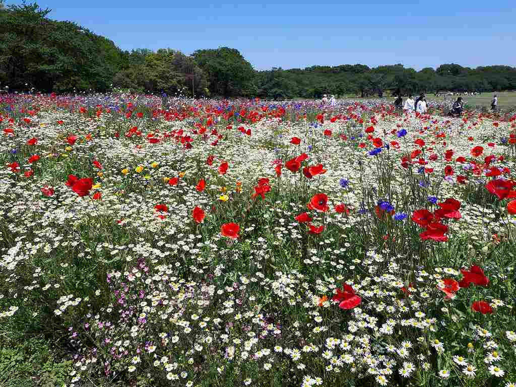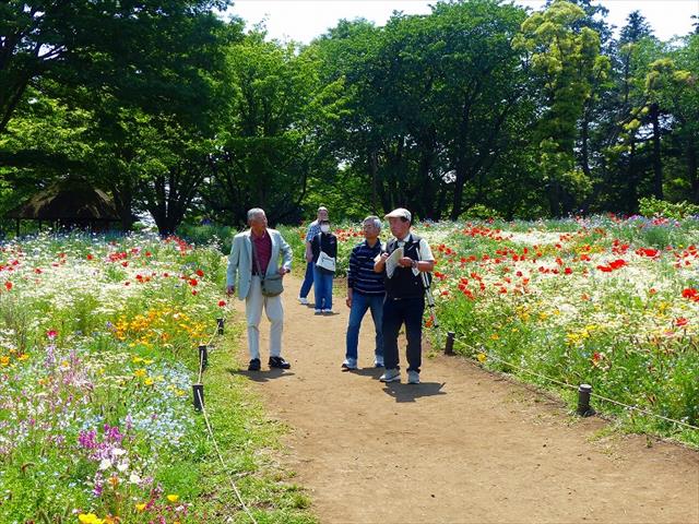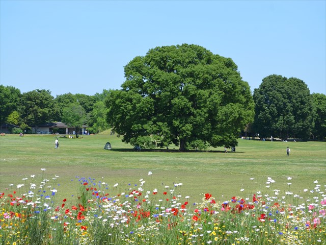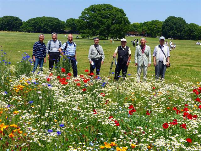 国営昭和記念公園は、昭和天皇御在位50年記念事業の一環として米軍の立川飛行場跡地につくられた総面積180haにもおよぶ国営公園です。 昭和58年10月26日、第⼀期開園区域として70haが開園しました。東京都立川市・昭島市にまたがって位置し、『緑の回復と人間性の向上』をテーマに、豊かな自然環境の中で多彩なレクリエーション活動の場となるよう計画されました。当日は快晴に恵まれ、国営昭和記念公園のヒナゲシから品種改良されて出来た色鮮やかなシャーレーポピー、ネモフィラ、クルマギク等、どこを見てもブーケのような「ブーケガーデン」、隣接の東京ドーム2つ丸々入る広々とした「みんなの原っぱ」、「水鳥の池」を散策しました。限られた時間の中で、公園内を1周する「パークトレイン」に乗車して公園内の見どころ紹介を楽しんだり、「日本庭園」を見学したり、それぞれ楽しむことが出来ました。