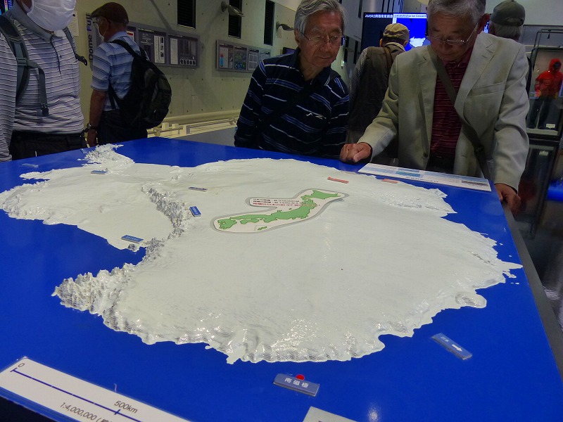次に、南極大陸と北極圏に観測基地を擁し、極域での観測を基盤に総合研究を進めている国立極地研究所の広報展示施設の「南極・北極科学館」を見学しました。南極や北極でどんな観測や研究を行われているかを紹介しています。入ってすぐに南極の氷が展示されており直に手を触れることも出来ました。また南極大陸の縮小模型に日本列島が数個がすっぽり納まり、いかに南極が広大かを改めて知ることが出来ました。1968年〜1969年に昭和基地から南極点まで往復した雪上車の実物展示やオーロラシアターでオーロラの映像を楽しみました。
