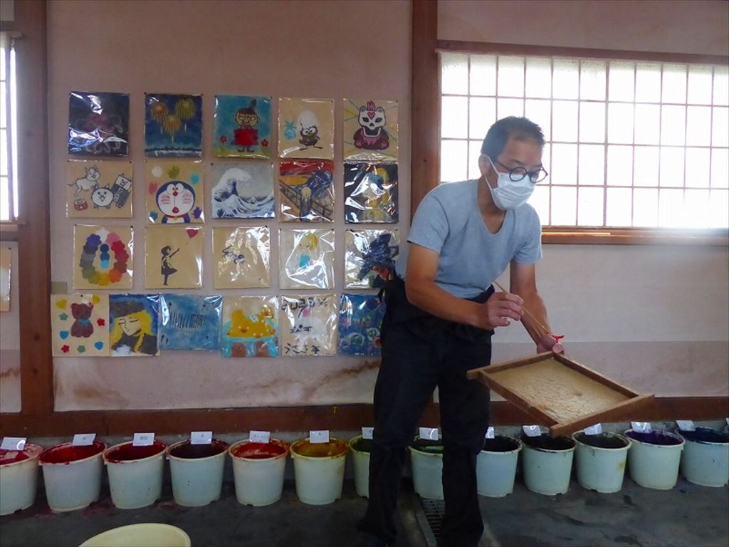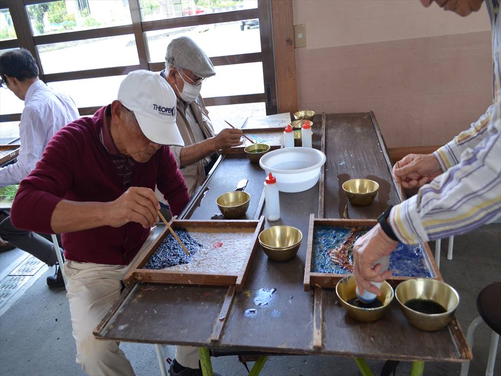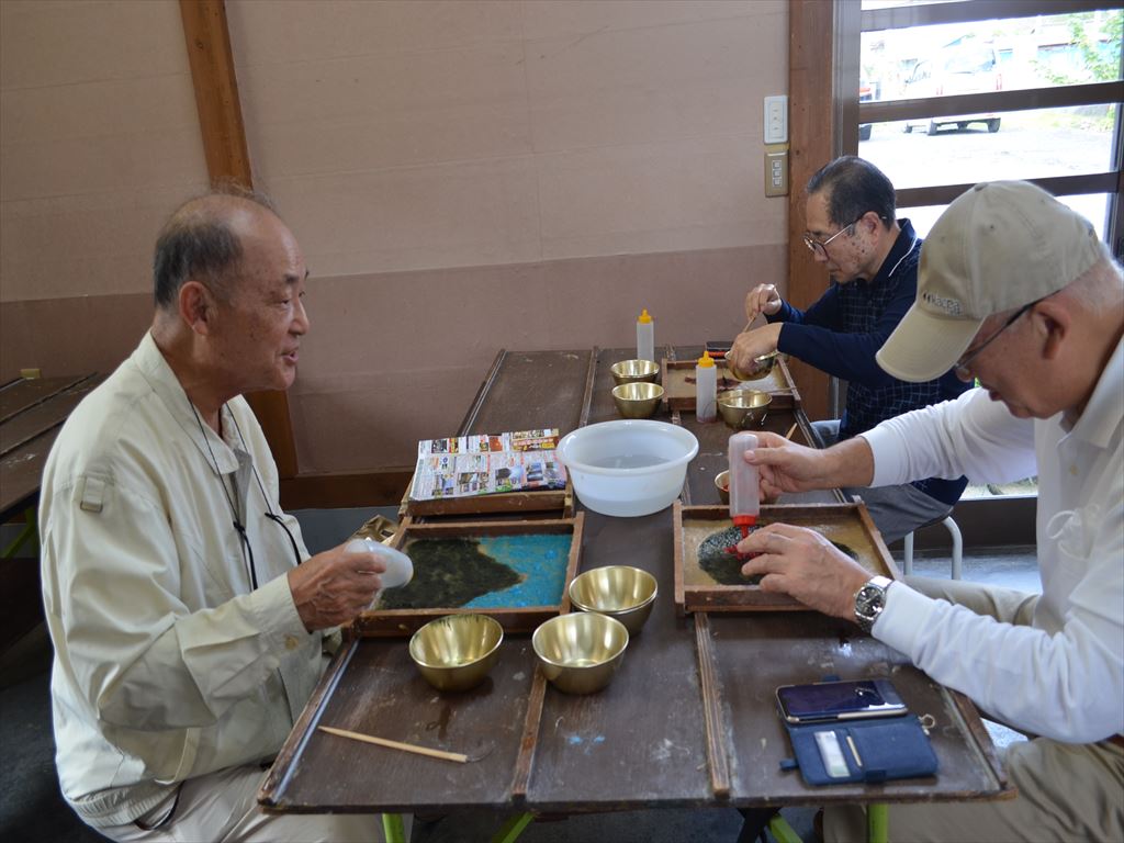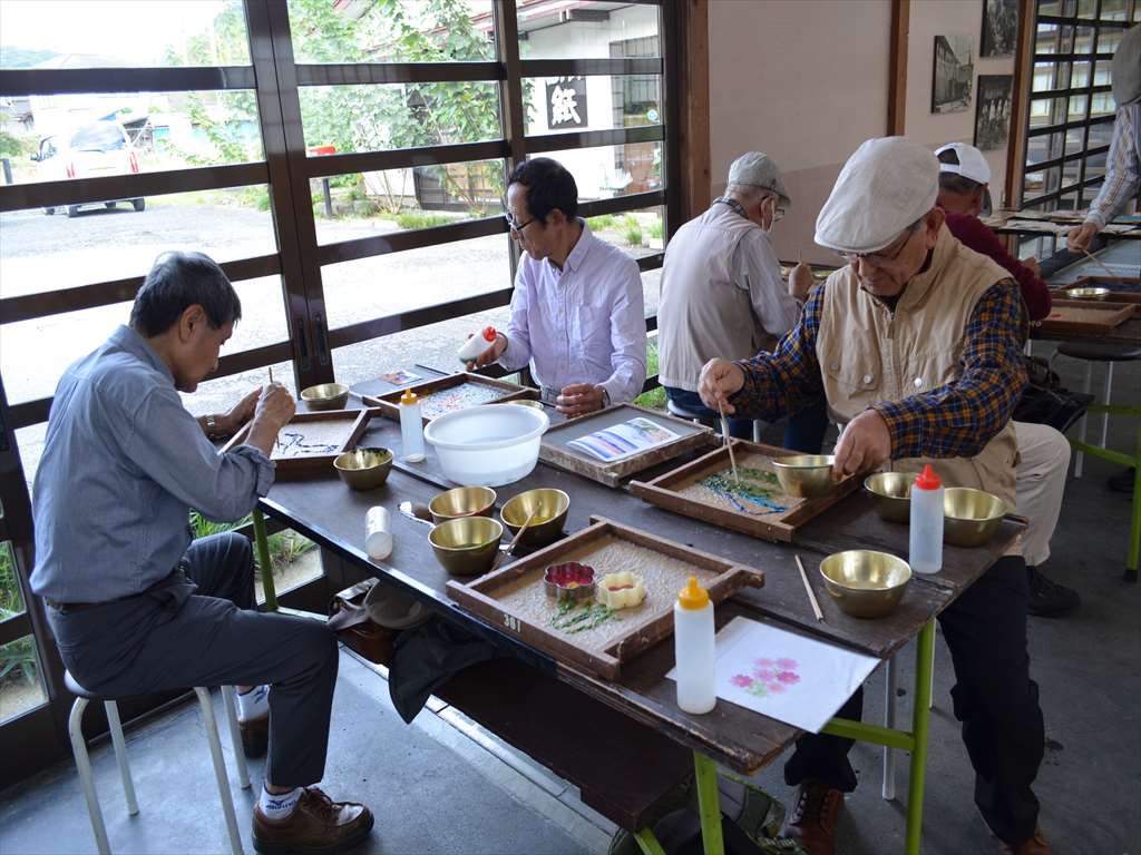 館内では、原料と用具の展示のほかに、机の広さ程のサイズから画用紙くらいの和紙まで、展示と販売がされていました。さらに、和紙を使ったコースターなどの作品も見られました。また、普段目にすることのない「楮」(こうぞ)を手にすることも出来ました。 ここでは体験として、『漉き絵』に全員が取り組み、それぞれ思い思いの絵に取り組みました。皆さん真剣そのもので、殆ど話し声が聞こえないほどでした。乾燥を必要とするので、作品は後日自宅に届けてもらうことになりました。
