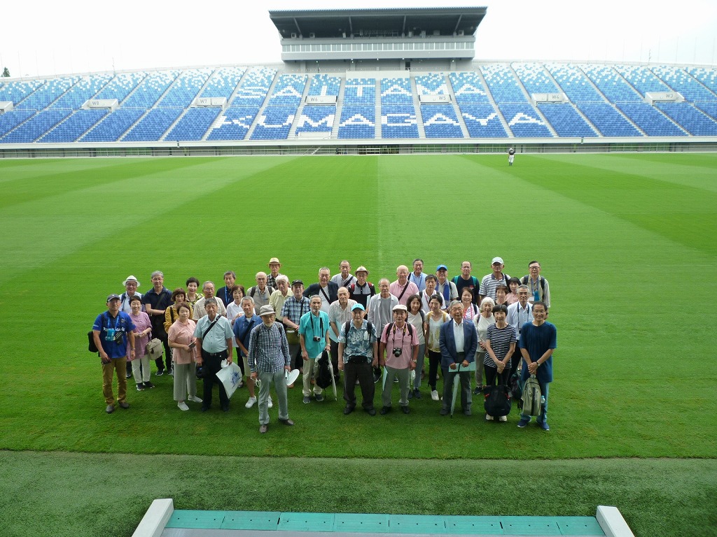 昼食後は、熊谷ラグビー場を見学。ラグビー場は隣接して同じ大きさの天然芝のグラウンドが3面あり、大学リーグや高校選抜大会にも対応できるようになっています。観客収容人数2万4千人のAグラウンドでは、芝生に触ることを許され、美しく整備された芝の感触を楽しんでいました。また皇族等が使用される特別室も見せていただき、束の間VIPな気分を味わいました。