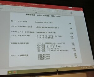 食事後はご歓談と併せて、協力いただいた各社からご提供の品を賞品として大抽選会を開催。