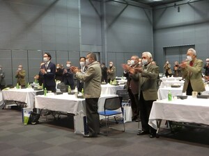 例年は立食形式でしたが、今回はテーブルに4人掛けでお弁当を頂く形にして出席者の皆様には黙食(食する以外はマスク着用)をお願いいたしました。予めテーブルにはお弁当と飲み物(お茶とビール)が人数分置かれての会食となりました。