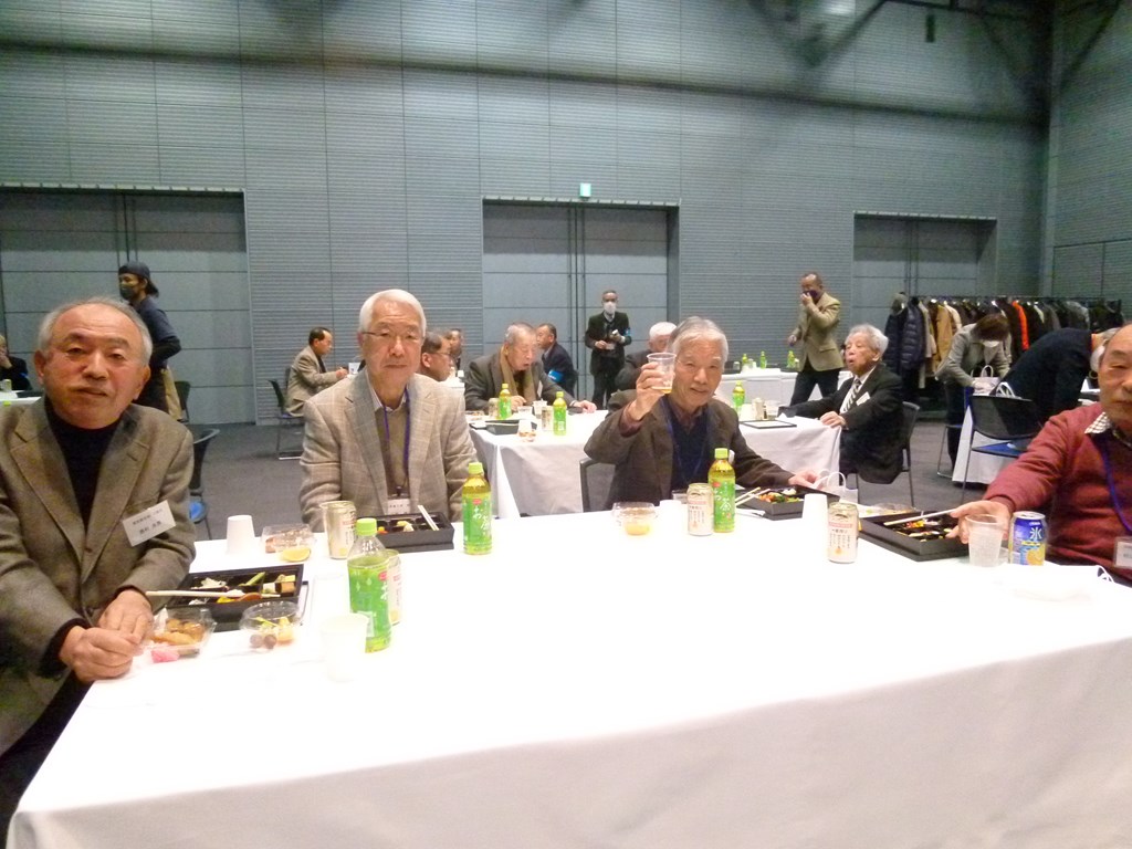 例年は立食形式でしたが、今回はテーブルに4人掛けでお弁当を頂く形にして出席者の皆様には黙食(食する以外はマスク着用)をお願いいたしました。予めテーブルにはお弁当と飲み物(お茶とビール)が人数分置かれての会食となりました。