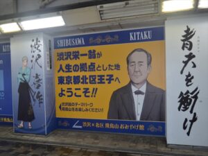 ⑥「渋沢栄一ラッピングポスト」2021年3月に「飛鳥山郵便局」の前に設置されています。渋沢が手掛けた銀行、鉄道、ビール、ガス、物流などの事業が散りばめられています。