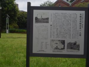 ⑤「旧醸造試験所第一工場」ここは通称「赤煉瓦酒造工場」と呼ばれ国の重要文化財です。明治27年に設立した大蔵省醸造試験所の清酒醸造研究の試験工場として建設され、日本酒の品質向上に寄与。赤煉瓦は渋沢栄一らが設立した日本煉瓦製造(株)の煉瓦が主に使用されています。