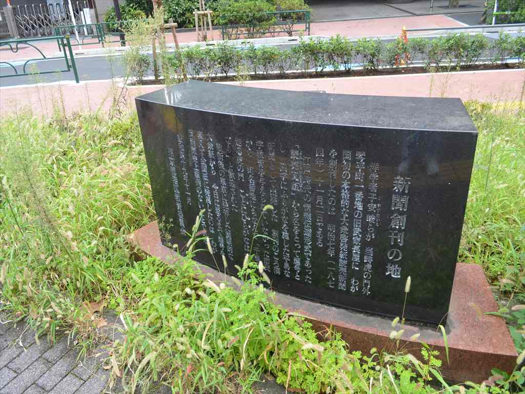 ① 「新聞創刊の地」虎ノ門交差点を西に入り込んだ場所に黒い石碑が建っている。ここは読売新聞発祥の地である。読売新聞は1874年(明治7年)この地で「日就社」によって創刊された。1889年(明治22年)坪内逍遥が文学主筆となる。尾崎紅葉、幸田露伴が入社。1917年(大正6年)「日就社」が「読売新聞社」に社名変更された。著名な文筆家が集まっていたのですね。