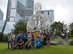 ⑤ 「虎ノ門ヒルズオーバル広場」街の象徴となるパブリックアートと共に広大な芝生が広がる、人と人をつなぐ街の中心となる広場。(広場内にて記念写真)新虎通りを東(新橋方面)へしばらく歩きます。
