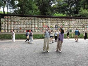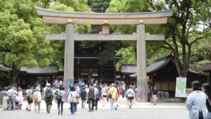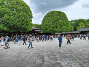① 【明治神宮】明治神宮が出来る前はこの辺り一帯は南豊島御料地(皇室の所有地)といって、現在の御苑一帯を除いては畑がほとんどで、荒れ地のような景観が続いていました。渋谷区代々木に1920年(大正9年)創建。明治天皇と昭憲皇太后がお祀りされています。御社殿が鎮座する約70万㎡の杜は、人々のまごころでつくられた人工林です。植栽するそのほとんどは献木で、全国から約10万本が奉献され、述べ11万人の青年が勤労奉仕を行い、植林や参道つくりに汗を流してこの明治神宮の杜がつくられたのです。本殿にて参拝後、西参道へ(本殿前にて記念写真 宝物殿前にて休憩・記念写真)北参道を通り、原宿駅に戻り、代々木公園に入ります。