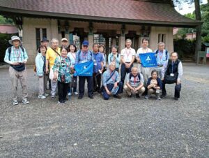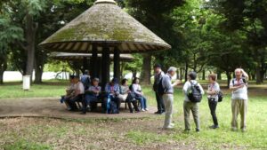 ② 【代々木公園】原宿駅からほど近い代々木公園は、都立公園の中で5番目に広く、約54ヘクタール(東京ドーム約11個分)で、森林公園と陸上競技場や野外ステージを備えた2つの地区に分かれています。元々陸軍練兵場で、戦後は米軍の宿舎敷地(ワシントンハイツ)、1964年の東京オリンピックの時には選手村として活用され、その後公園となりました。※ワシントンハイツとは、第二次世界大戦後の日本において、日本を占領していた連合国軍の一部であるアメリカ軍の兵舎・家族用居住宿舎などからなる軍用地の名称。(代々木公園休憩舎にて休憩・園内の花壇をバックに記念写真)代々木公園出口にて12時30分頃の解散となりました(名札回収)
