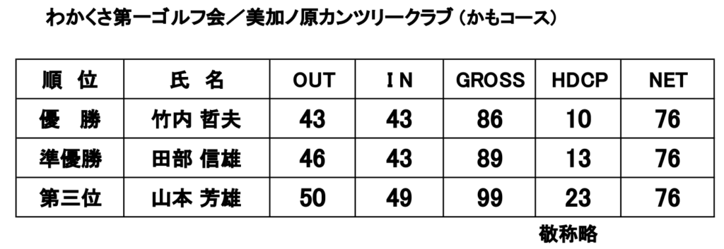 上位3人のNetスコアがなんと同じでした。プロであればプレイオフでしょうが、アマであり、Hdcp順で「竹内さん」が優勝となりました。