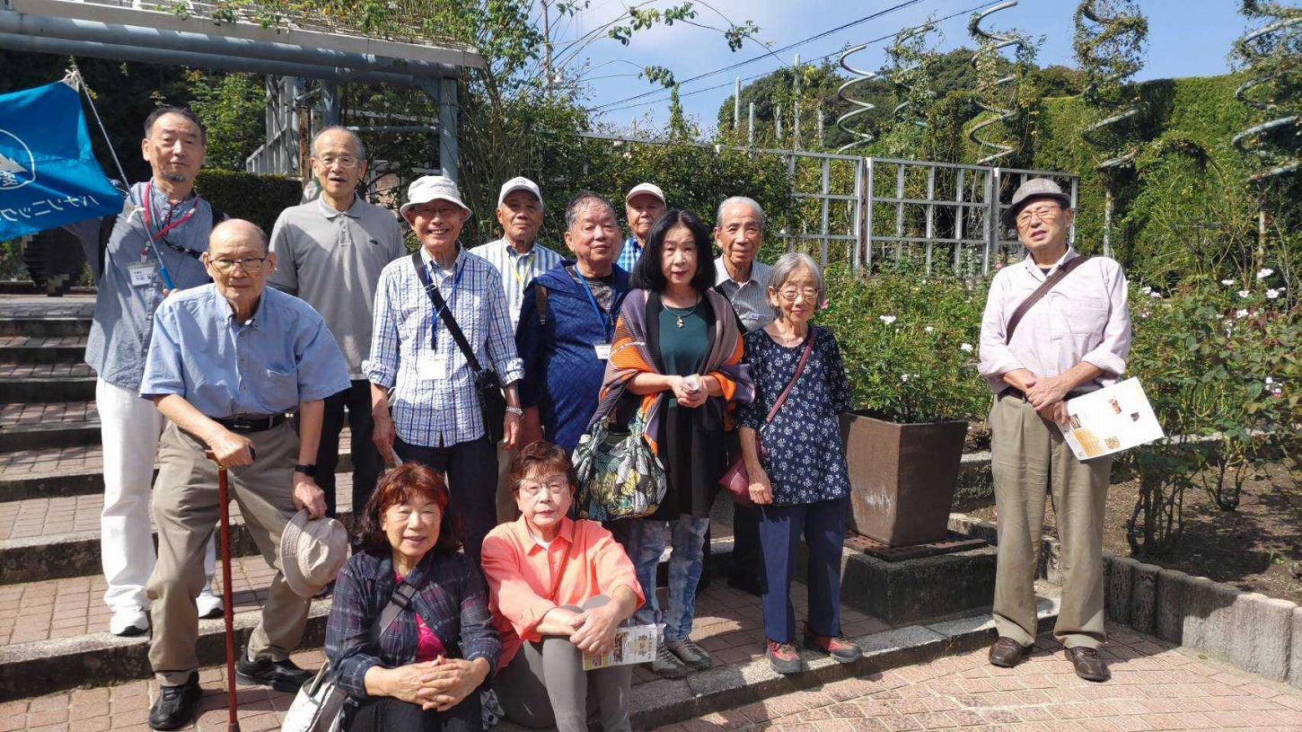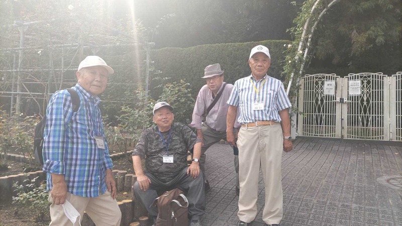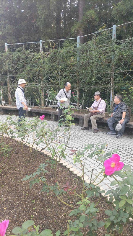 現地で3名の直行組と合流。 下見の時にバラ園は10月23日の開花に向け剪定するので、10月14日はバラは咲いていないと言われていてバラ園は諦めていましたが、バラ園に行くと2割位の開花で暑い日差しの中、数少ない開花したバラので記念撮影「ハイポーズ」!