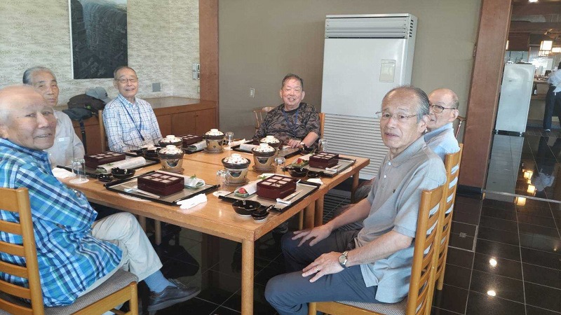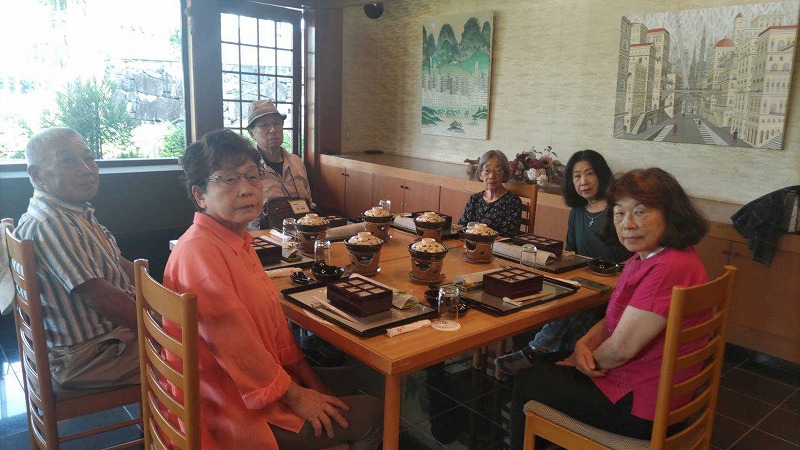 山内は木陰が涼しく、八体仏霊場、行基像や重要文化財の三重塔、を散策しました!山内は木陰が涼しく45分間の短い様な、長いような散策を終え食事処の『薬膳カフェ花美津姫』にて昼食懇親『バラ御膳』で量が多く満腹に・・・!1時間1本のバスに乗り遅れないように中締めし帰路に!