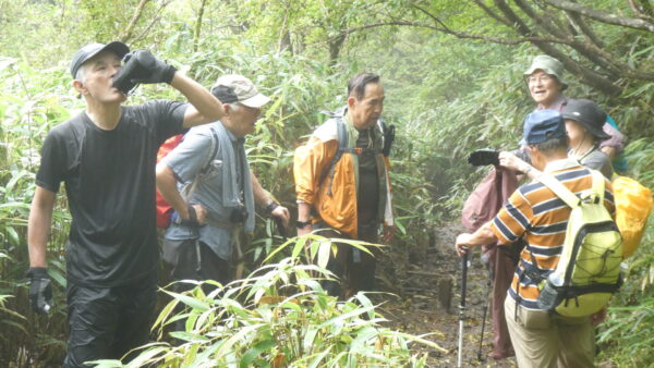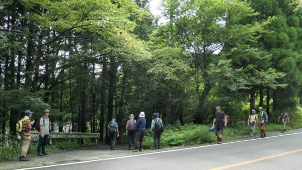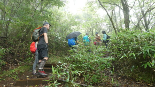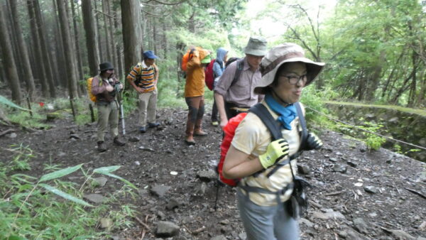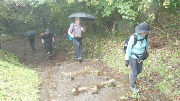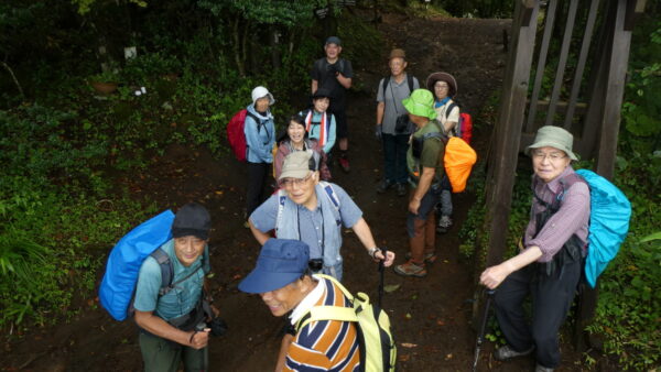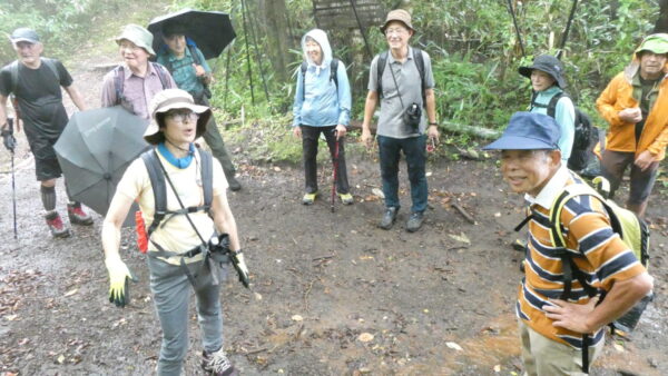 2023年9月山行は「箱根・乙女峠ー長尾山」で参加者は12名でした。箱根登山鉄道・箱根湯本駅3番バス乗り場9時集合・10分発に乗車、乙女口下車。山行を開始しました。麓では日差しがありましたが、台風13号の影響もあり山行開始ころには雲が徐々に山並みを被い小雨から本降りとなりましたが乙女峠を目指しました。峠到着時、小雨になり長尾山まで続行することにしました。長尾山で昼食後、スマホ天気予報では再び雨が予想されたため金時山への登りを中止し、上りコースを折り返し下山をしました。下山後は、岩風呂温泉にて休息&懇親会を平日の体力維持方法や山行の楽しみについて意見交換ができました。 コースタイム :3時間36分 上り:421m、くだり:411m
