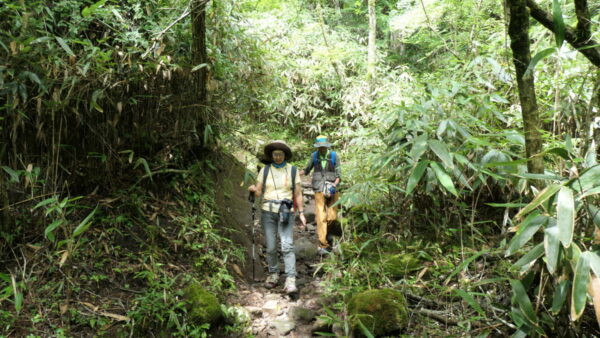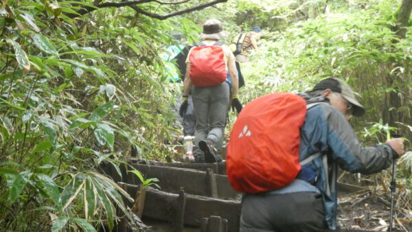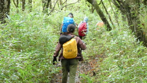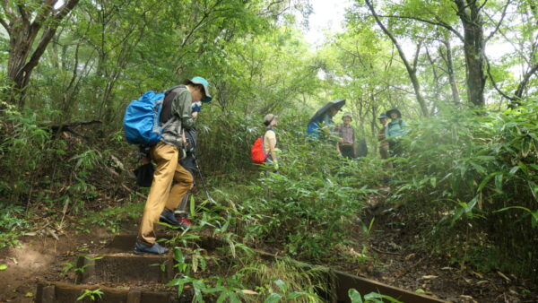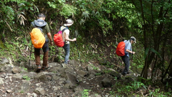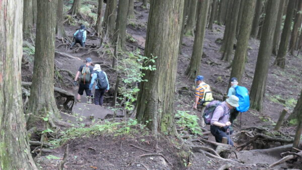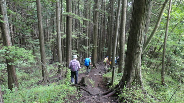 - 成長した杉林の中のハイキングコースを上る