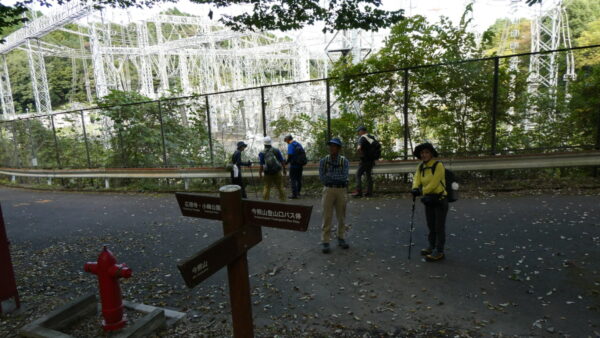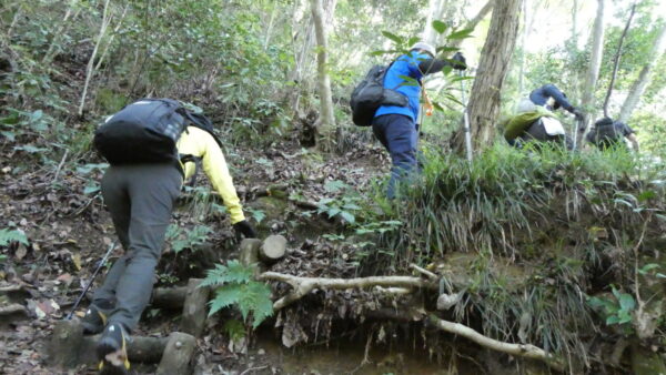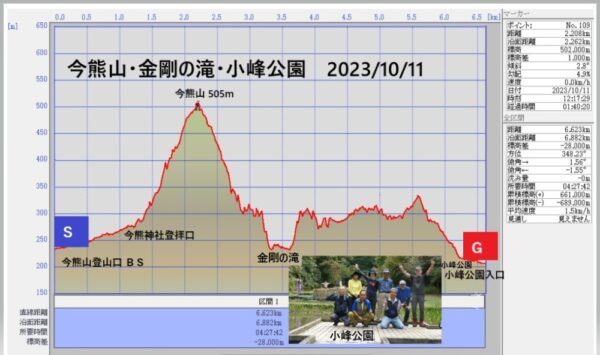 今熊山山頂で昼食をとった後、金剛の滝への急下降の道や葛折りの急階段を降り、谷間の涸れ沢を進んで落差約18mの金剛の滝を見物しました。次に小峰公園をめざして尾根筋まで登り返し、東京電力新多摩変電所の境界線を通り小峰公園ふれあい広場に無事到着しました。 コースタイム:4時間27分 距離:6.5km 上り:530m、下り:559m