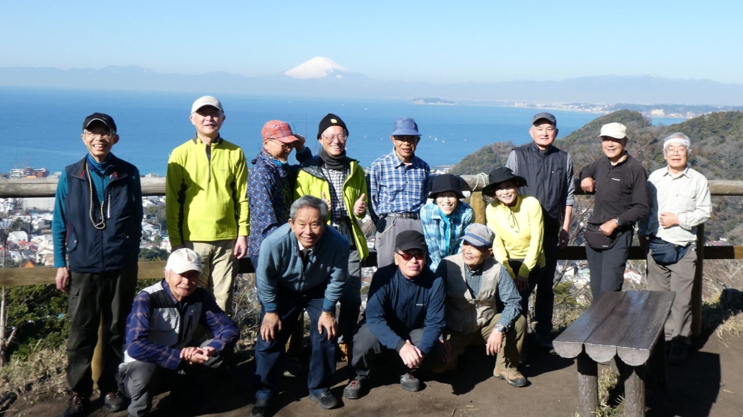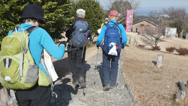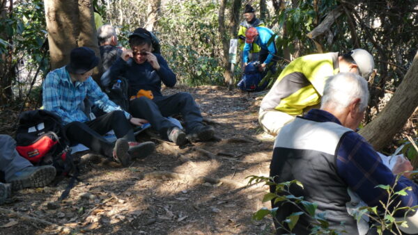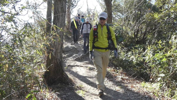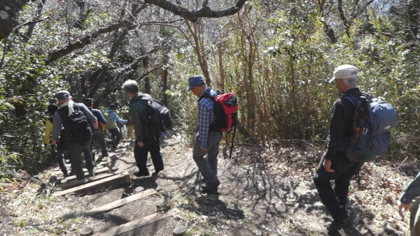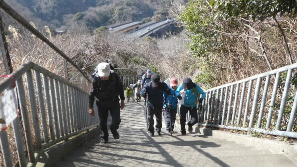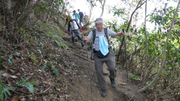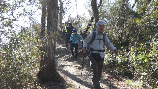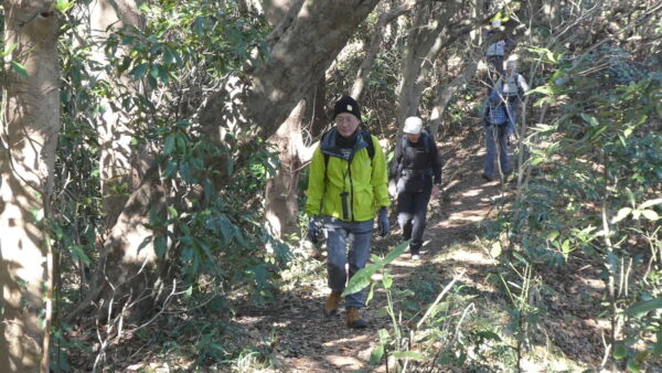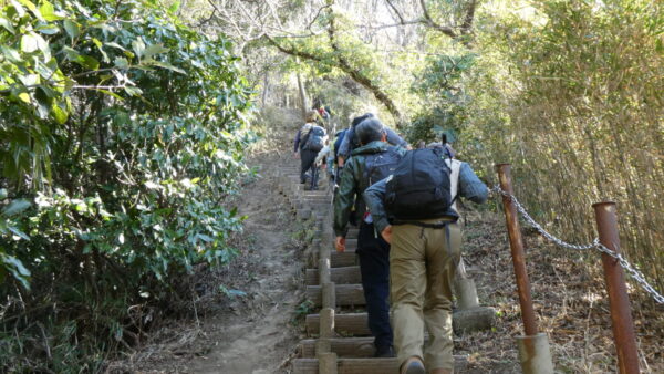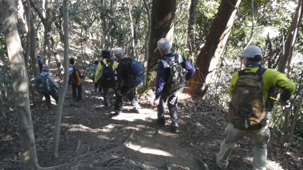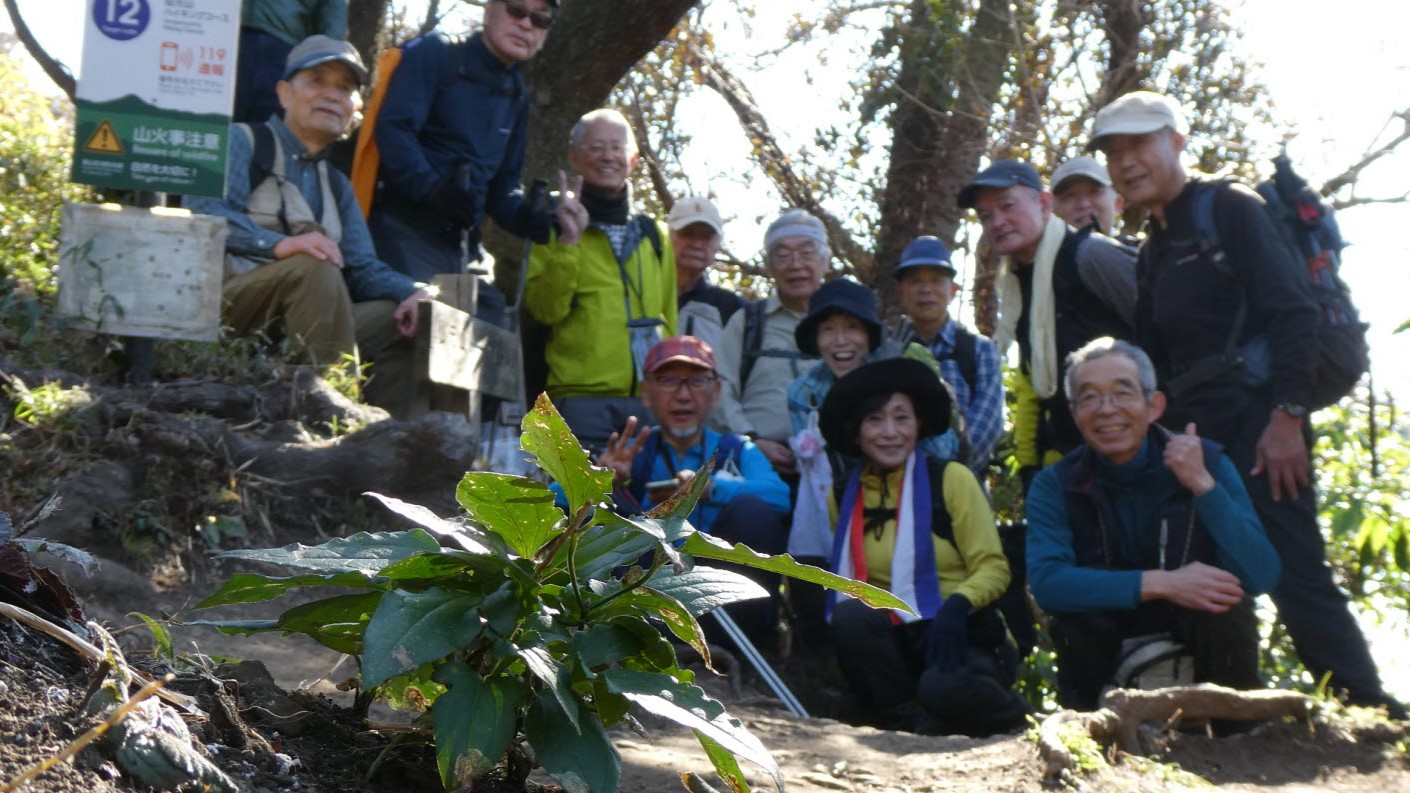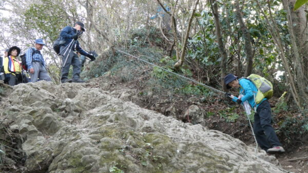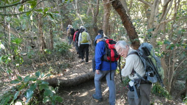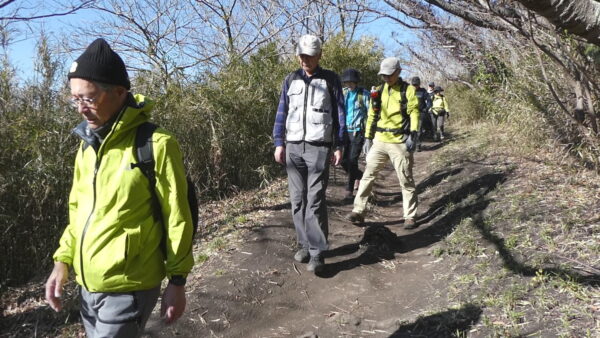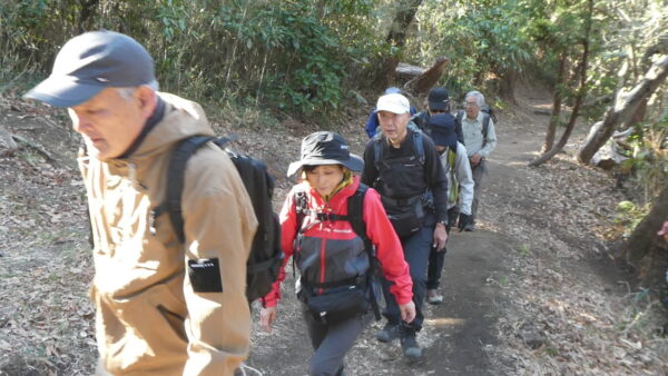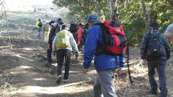 2024年2月山行は「三浦アルプス南尾根」で参加者は14名(2名は新会員)でした。当初予定日は、雪&雨の影響でアップダウンが多いコースでの安全を考慮し予備日(2月14日)に変更しました。JR逗子駅に9時に集合・9:07発京急バスに乗車、風見橋で下車し、新会員2名の紹介・本日のリーダからコース案内・アップダウン時ロープ使用の注意点等を説明後山行を開始しました。仙元山では天候に恵まれ相模湾・江ノ島・富士山の景観を満喫しました。仙元山→戸根山→観音塚→高塚→大桜→栗坪分岐→三国峠→乳頭山と多くのアップダウンを乗り越えて、横須賀港が見える乳頭山景観スポットに到着。護衛艦・潜水艦や軍港全体の外観が良く見えました。乳頭山からは、本日最大の難所をロープをたよりに下り田浦梅林へ全員無事到着できました。梅林で見学・休憩後、京急田浦駅・JR田浦駅へ向かいゴールできました。 コースタイム:5時間48分
