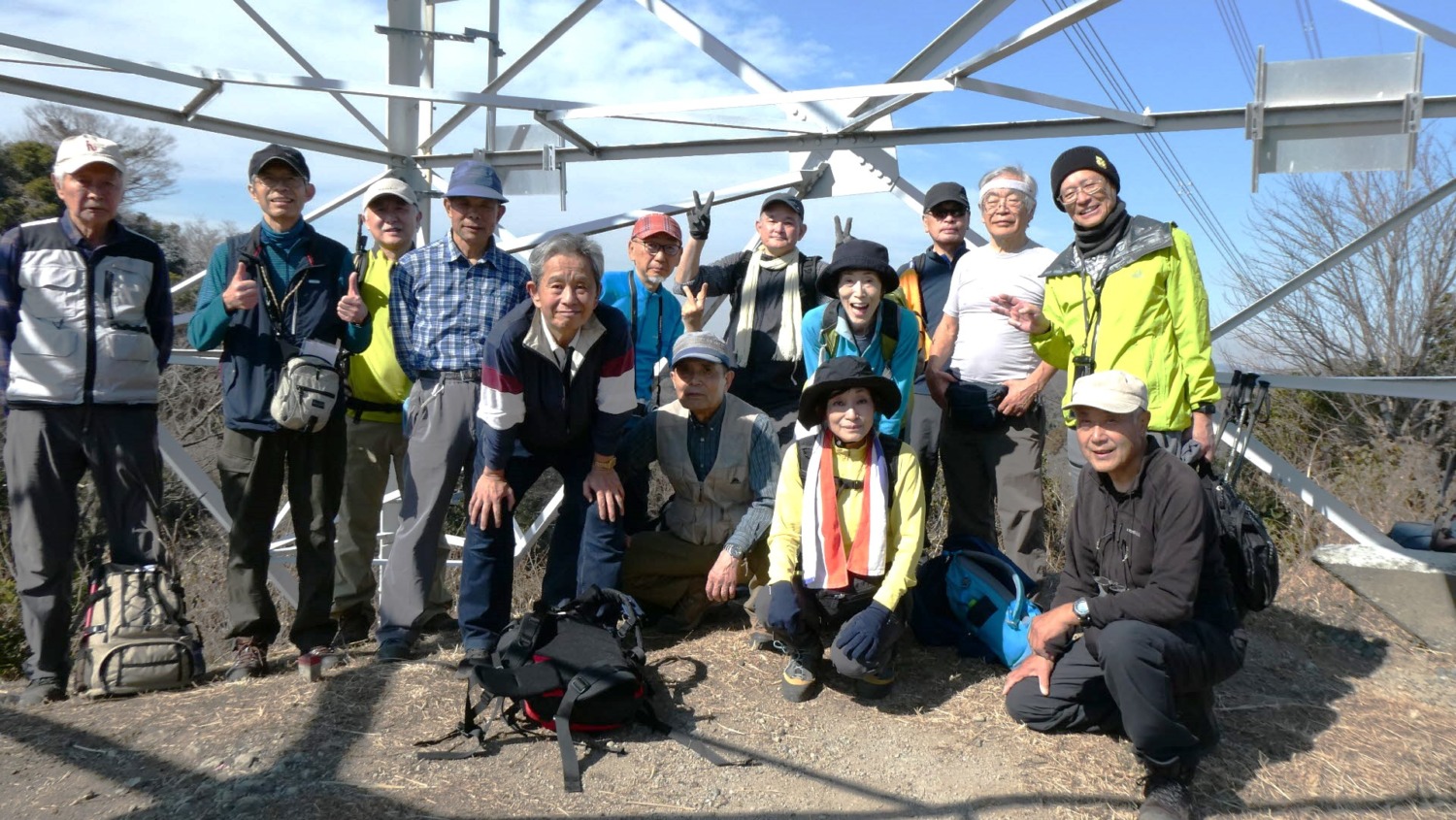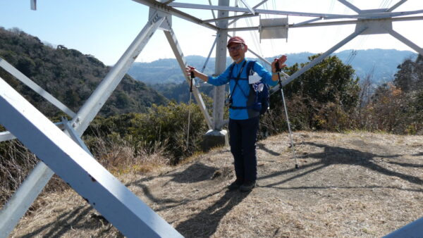- 見晴らしの良い茅塚の高圧線鉄塔下で記念撮影