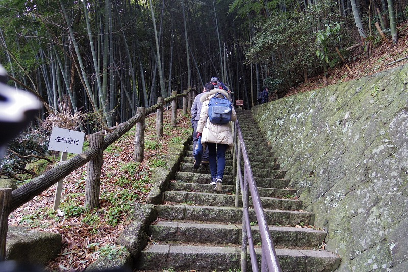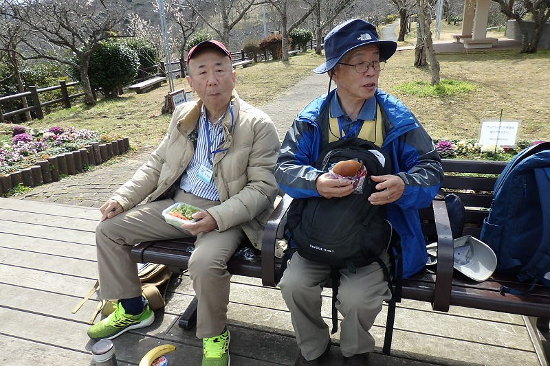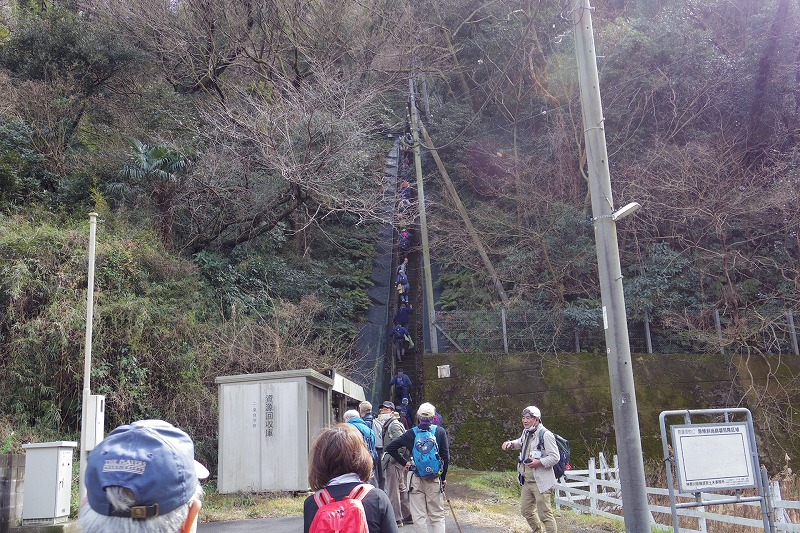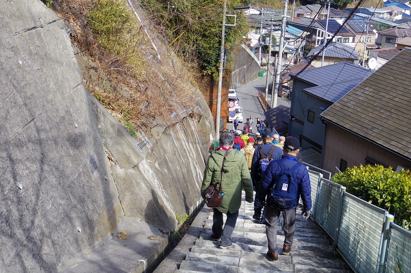 海軍通信教育発祥記念碑の前で休憩。横須賀線の踏切を渡り、田浦梅の里入口から長い階段を休み休み登り田浦梅の里の休憩所で休憩、自由行動。