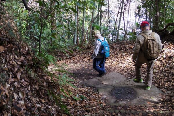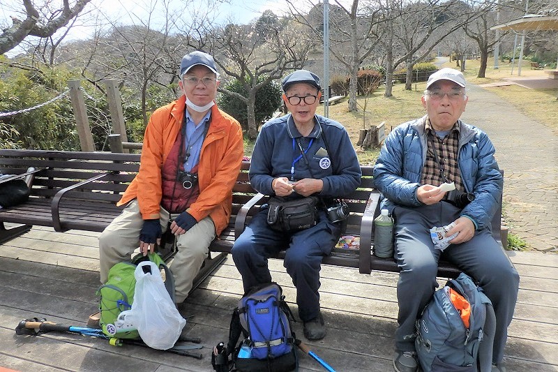 記念写真を撮り休憩所横の坂道を降り十三峠に向かい、再び急階段を上り十三峠の道に出て、安針塚で三浦安針の墓をお参りして塚山公園に向かい塚山公園中央広場で休憩と昼食。塚山公園展望デッキで横須賀港・浦賀水道の艦船を見て過ごしました。