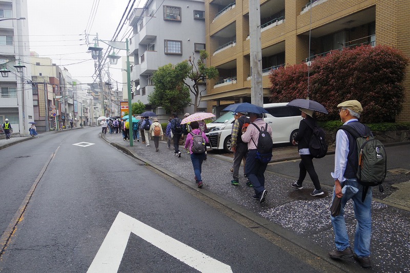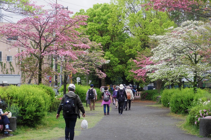 2019年4月25日(木)平成最後のぶらり会は、朝から小雨降る中、新会員1名を含めて30名で実施しました。東横線綱島駅改札前に10時に集合。受付を済ませて駅西口から少し歩いた東照寺の駐車場前に移動して世話役の挨拶、コース説明、新会員の自己紹介を聞いて小雨が降る中スタート。綱島西口商店街を通り、新緑の綱島市民の森を歩き、隣接の綱島公園で小休止。その後、東横線の歩道橋を渡り長福寺前を通り、綱島街道を横断。松下通信工業OBになじみの緩やかな坂道を登り諏訪神社をお参りしました。来た道と反対側の急な階段を下りて、元東京温泉があった場所で行われてる新綱島駅工事の現場を見ながら鶴見川の大綱橋を渡り、小雨が降り続く鶴見川河川敷歩き、太尾見晴らしの丘公園に到着。雨が止んだここで昼食と休憩。午後の歩きは、ここで記念写真を撮影してから開始。沢山の新緑の中を歩き新田緑道に到着。途中の専念寺に立ち寄り、続いて高台の新羽丘陵公園で休憩。ここで記念写真を撮り、北新羽杉山神社にてお参り。三度目の記念写真を二組に分かれて撮影した。つづいて、花いっぱいと新緑が眩しい、せせらぎ緑道を経て、横浜市営地下鉄の仲町台駅に到着。世話役の挨拶を聞いて15時に解散。無事終了しました。