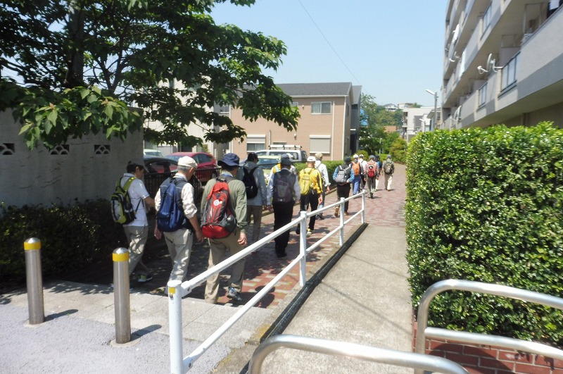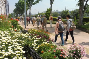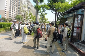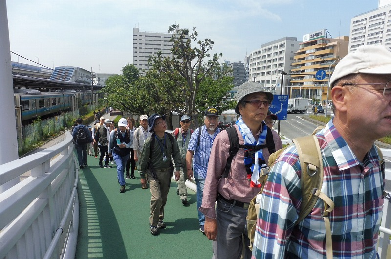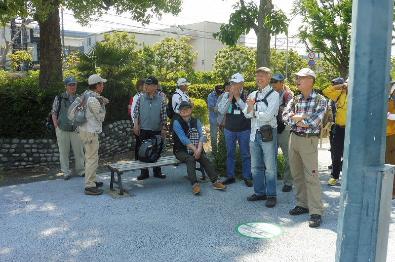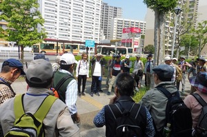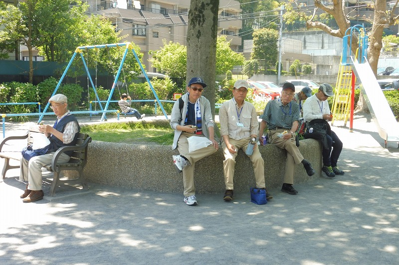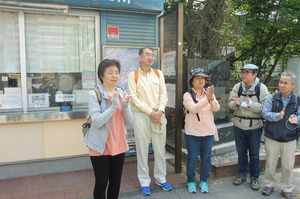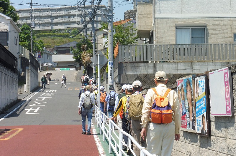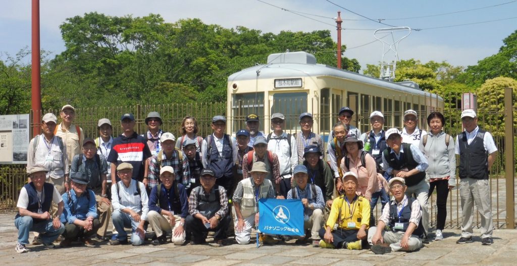 2019年5月11日(土)令和の最初のぶらり会は朝から晴れ。夏日の中、新会員1名を含めて34名の参加者で実施しました。JR根岸線磯子駅の改札前に午前10時集合。受付を済ませて西口の階段下のバス定期券売り場前に移動して世話役の挨拶、コース説明、新会員の自己紹介を聞いてスタート。歩道橋を渡り磯子産業道路沿いの散策路を根岸方向に歩き、途中の郵便局前の安藤橋の石碑を見て芦名橋公園で小休止。そして磯子旧道入り口信号を横断し、浜ストアの中を通り抜けて真照寺坂を登りステージ21マンションを眺め、磯子峰第二公園で小休止。水分を補給しての後、急坂を下り、金蔵院、日枝神社を通り磯子台へ再度登り、マルエツの前で小休止後、眼下の磯子の街を見て、有料のエレベーターで磯子駅入り口信号のところまで降り森二丁目公園で昼食と休憩。午後の歩きは、朝日不動滝、森浅間神社まで階段を登り、お参りの後に記念写真を撮り、久良岐公園に向けて汐見台の団地の坂道を歩き、久良岐公園の広場前で休憩。展示されてる市電の前で記念写真を撮り、公園内を散策し坂あり階段ありのアップダウンの道を京急線上大岡駅まで歩き、上大岡駅構内で世話役の挨拶を聞いて14時に無事終了しました。