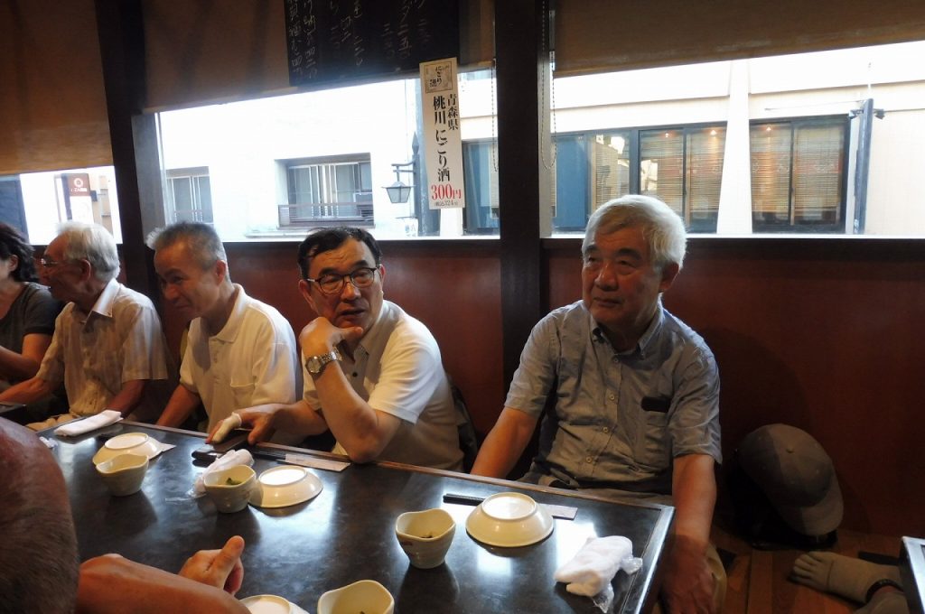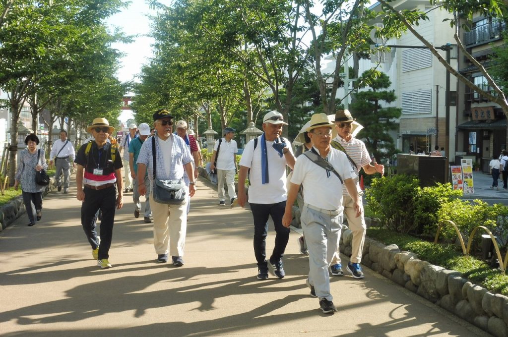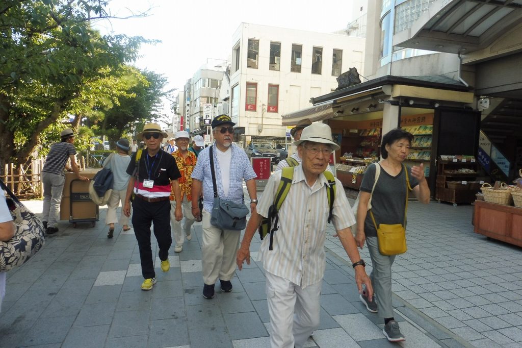 2019年8月8日(木)朝から夏の太陽が照り付ける中、17名の参加者で実施しました。JR横須賀線 鎌倉駅東口改札前に午後4時に集合。受付を済ませ、若宮大路の二ノ鳥居から段葛(だんかづら)を歩いて三ノ鳥居を通り、鶴岡八幡宮の太鼓橋前で今年で81回目になる参道に並ぶぼんぼり祭りを背景に記念写真を撮り、ここでぶらり会の団体行動から自由行動になりました。各自が多数のぼんぼりの鑑賞と舞殿での立秋祭の行事を見て、太鼓橋前に17時30分に参加者が集まり小町通を散策しながら鎌倉駅の近くの居酒屋に到着し、乾いた喉を潤しながら、あるこーる会を楽しみました。19時20分に解散し、無事終了しました。