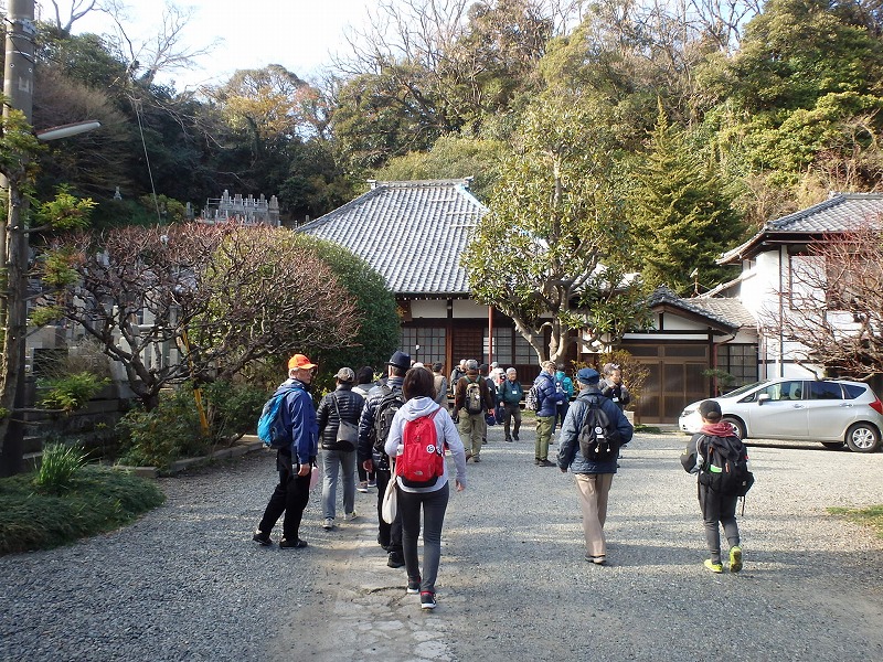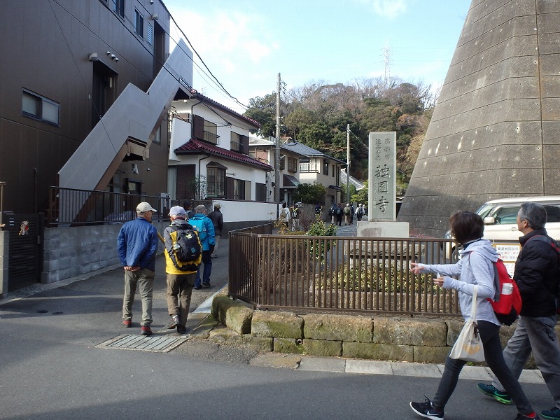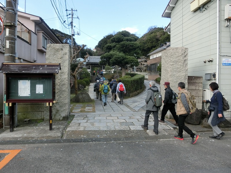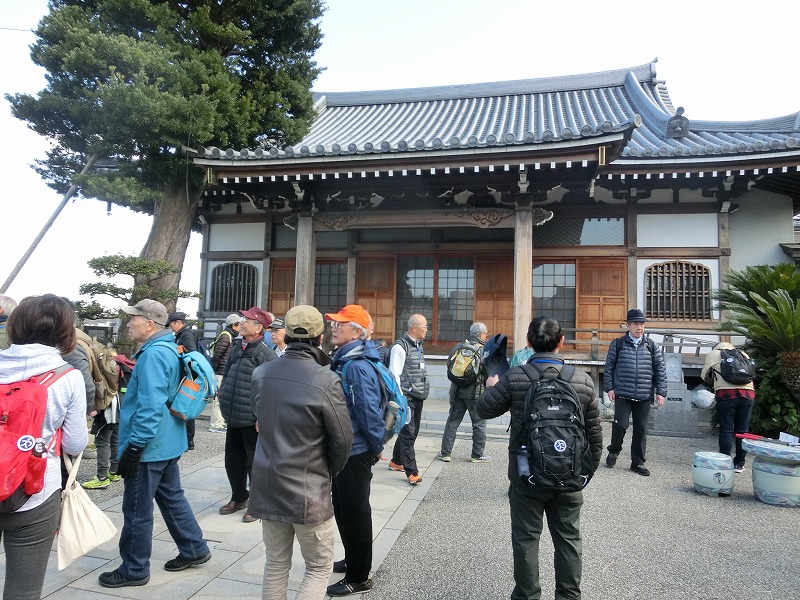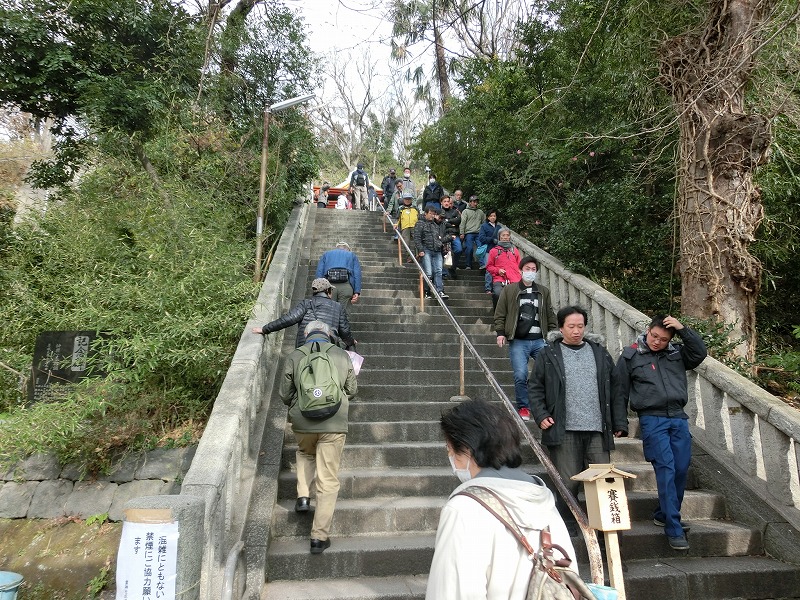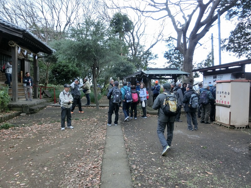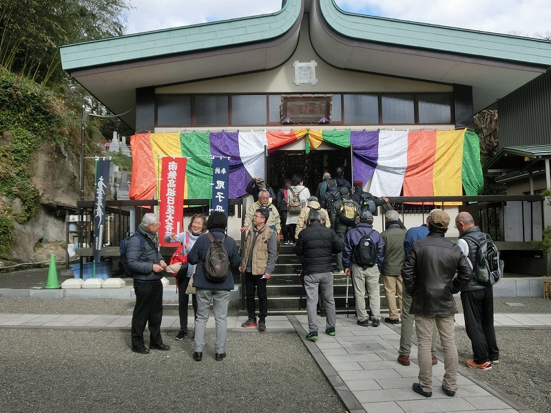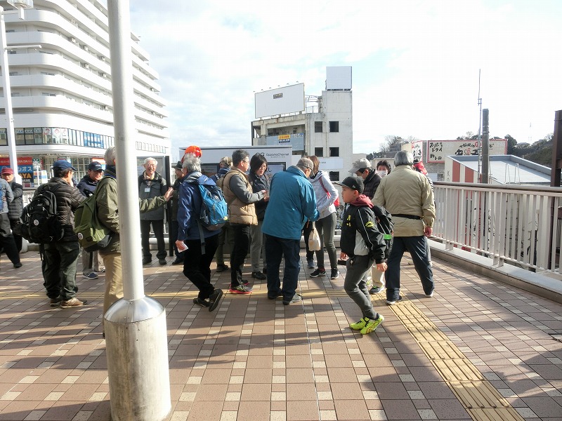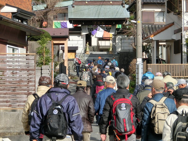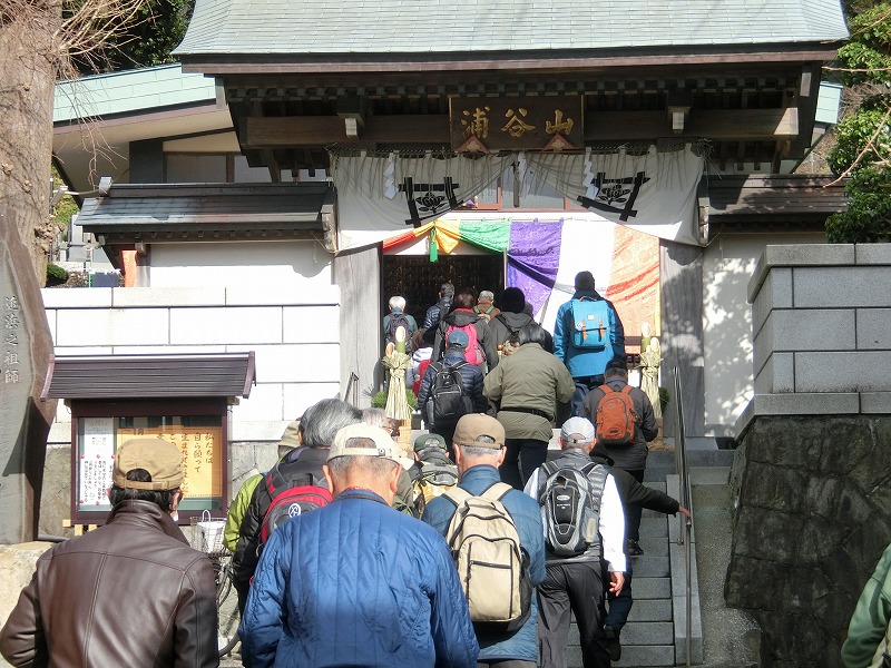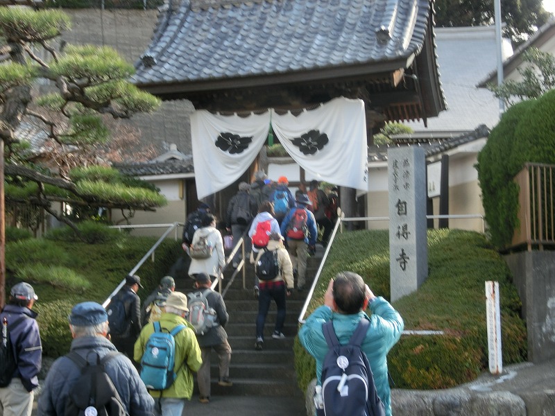 2020年(令和二年)の初歩きは新春恒例の七福神めぐりシリーズで追浜七福神巡りを好天の中、1月4日(土)45名の大勢の参加者で実施しました。京急線追浜駅の改札前で受付を済ませ、駅入り口の二階デッキに移動し集合。世話役の年頭の挨拶、コース説明を聞いてスタート。駅近くの雷神社、法福治(金毘羅天)、自得寺(大黒天)、正光寺(福禄寿)、良心寺(布袋尊)を巡り、コンビニ横から裏道に入り小さな平六トンネルを抜けて浦郷小学校の横を通り、観音寺(寿老人)を巡り急坂と階段を下り、浦郷の京急ストアで昼食を購入。深浦ボートパーク隣りの浦郷公園で恒例のお神酒を全員で頂きました。昼食と休憩の後に記念写真を撮り、能永寺(弁財天)、独園寺(恵比寿)、正禅寺(毘沙門天)と巡り、追浜公園で休憩。出発前に記念写真を撮り、追浜駅に向けて正月休みの商店街を通り、出発点の追浜駅に到着。世話役の挨拶を聞いて14時に解散、無事終了しました。