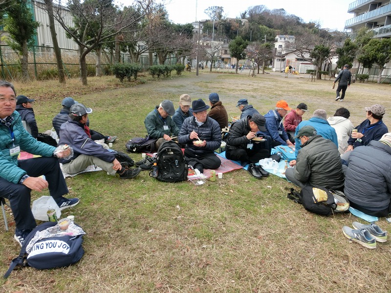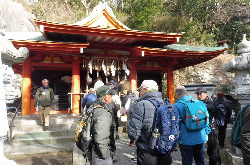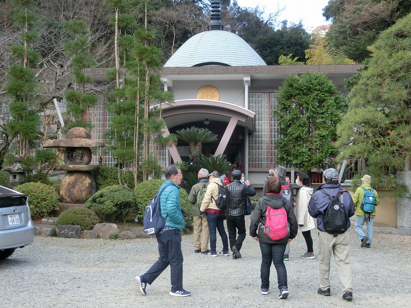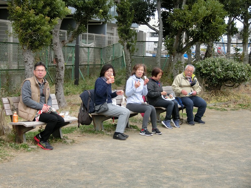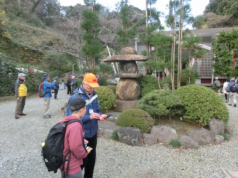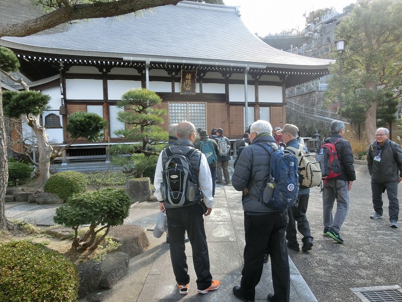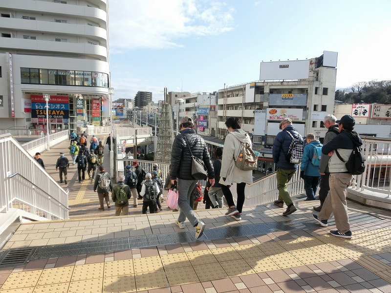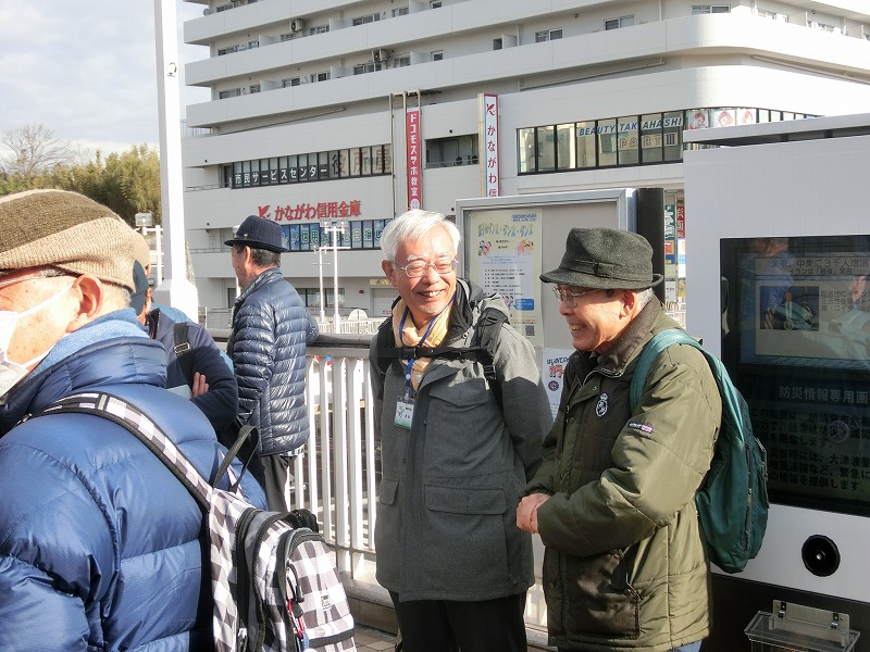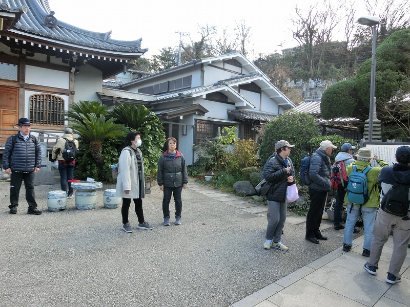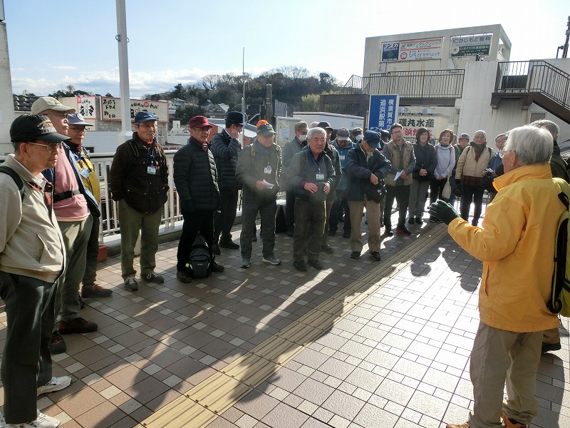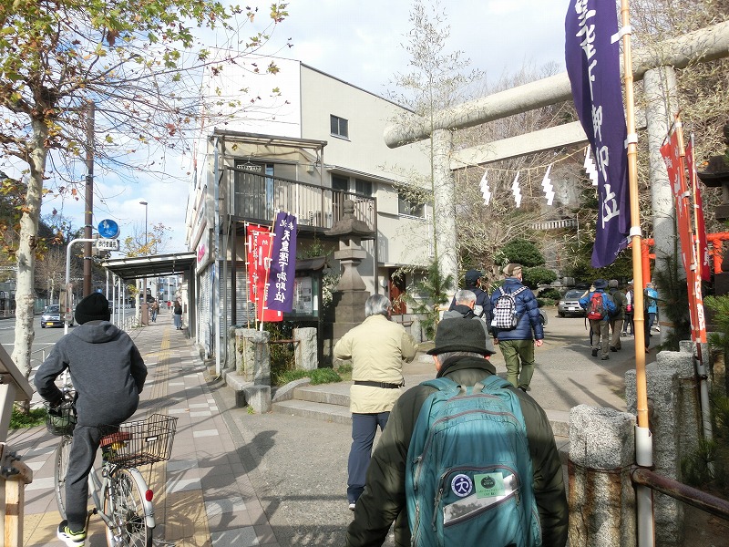 2020年(令和二年)の初歩きは新春恒例の七福神めぐりシリーズで追浜七福神巡りを好天の中、1月4日(土)45名の大勢の参加者で実施しました。京急線追浜駅の改札前で受付を済ませ、駅入り口の二階デッキに移動し集合。世話役の年頭の挨拶、コース説明を聞いてスタート。駅近くの雷神社、法福治(金毘羅天)、自得寺(大黒天)、正光寺(福禄寿)、良心寺(布袋尊)を巡り、コンビニ横から裏道に入り小さな平六トンネルを抜けて浦郷小学校の横を通り、観音寺(寿老人)を巡り急坂と階段を下り、浦郷の京急ストアで昼食を購入。深浦ボートパーク隣りの浦郷公園で恒例のお神酒を全員で頂きました。昼食と休憩の後に記念写真を撮り、能永寺(弁財天)、独園寺(恵比寿)、正禅寺(毘沙門天)と巡り、追浜公園で休憩。出発前に記念写真を撮り、追浜駅に向けて正月休みの商店街を通り、出発点の追浜駅に到着。世話役の挨拶を聞いて14時に解散、無事終了しました。