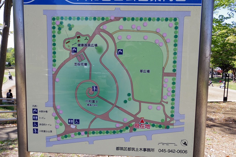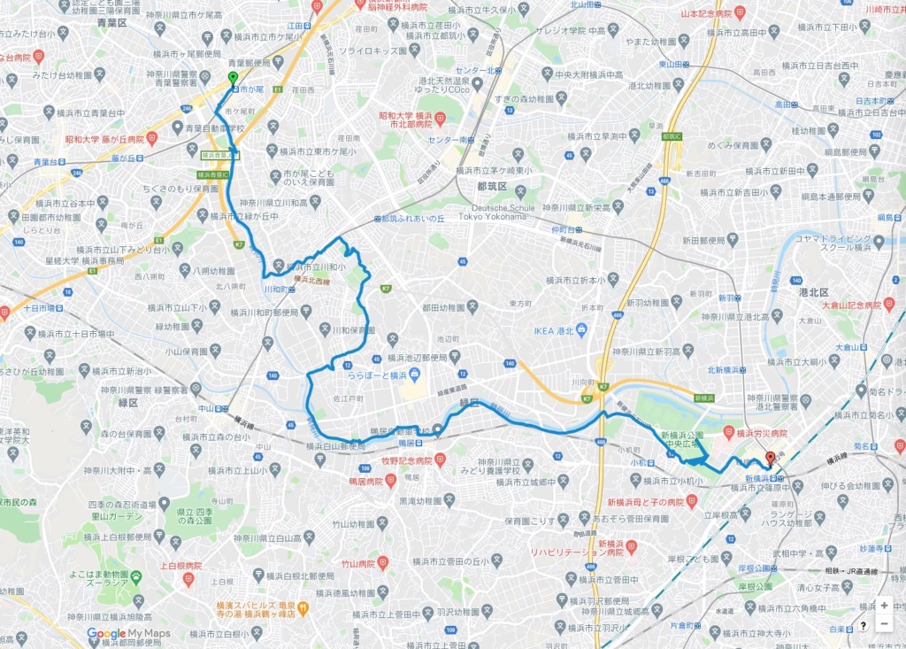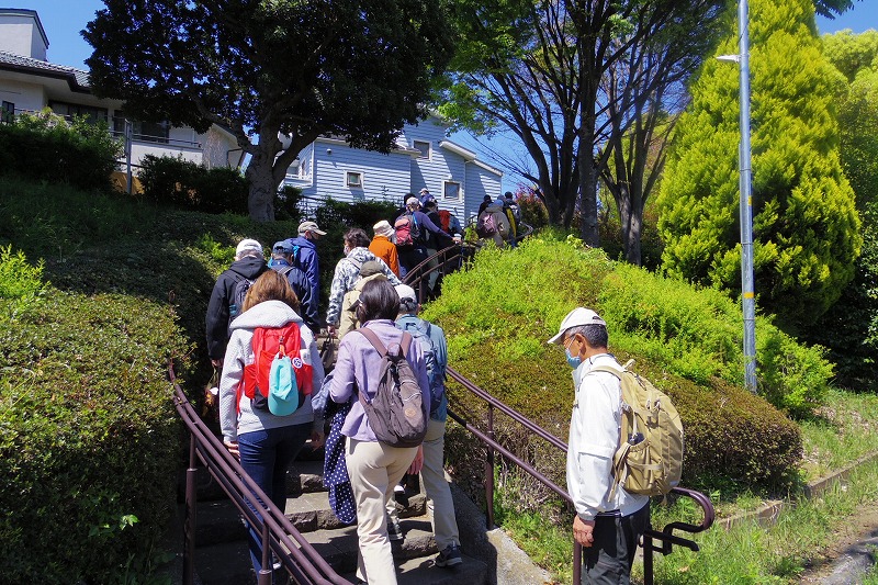 谷本川の遊歩道に入り精進橋の先から川和小学校、住宅街をを通り、区役所通りを渡り高台の富士見ヶ丘団地から川和富士公園に到着。