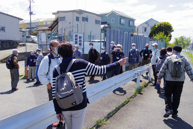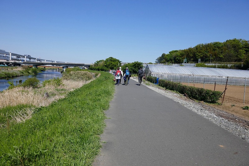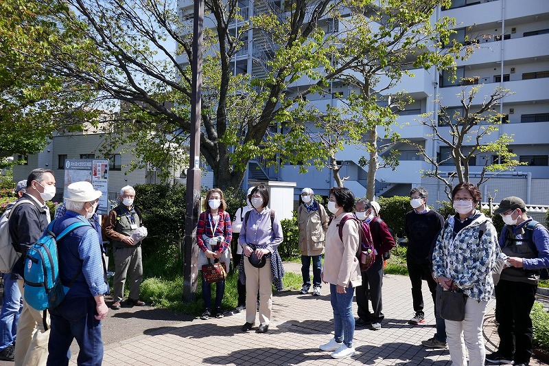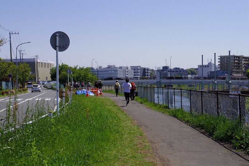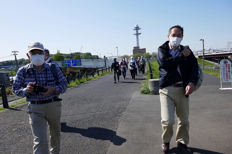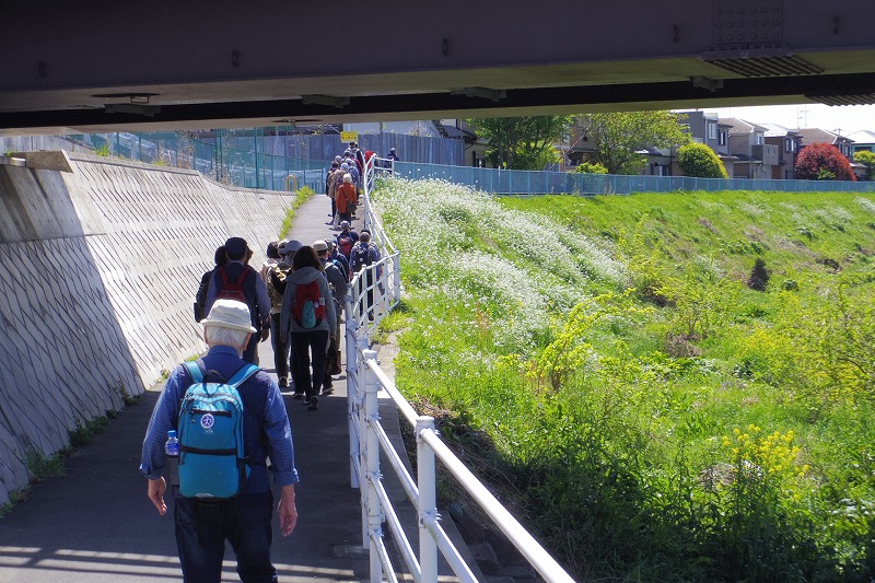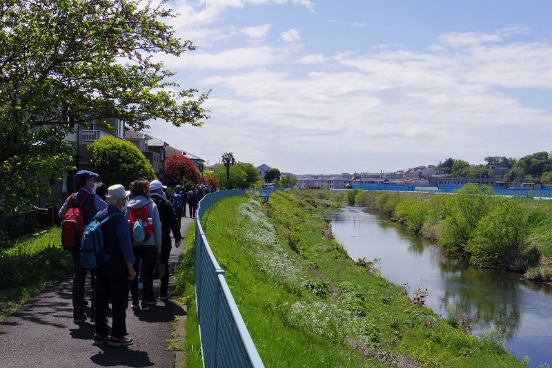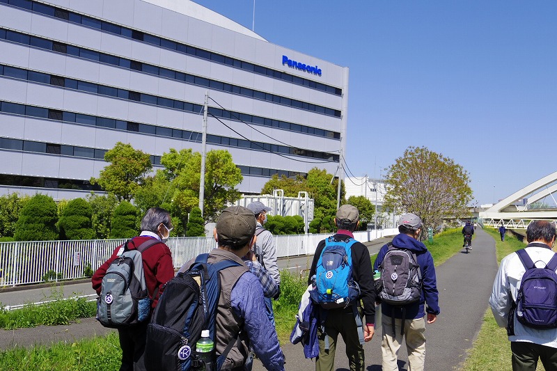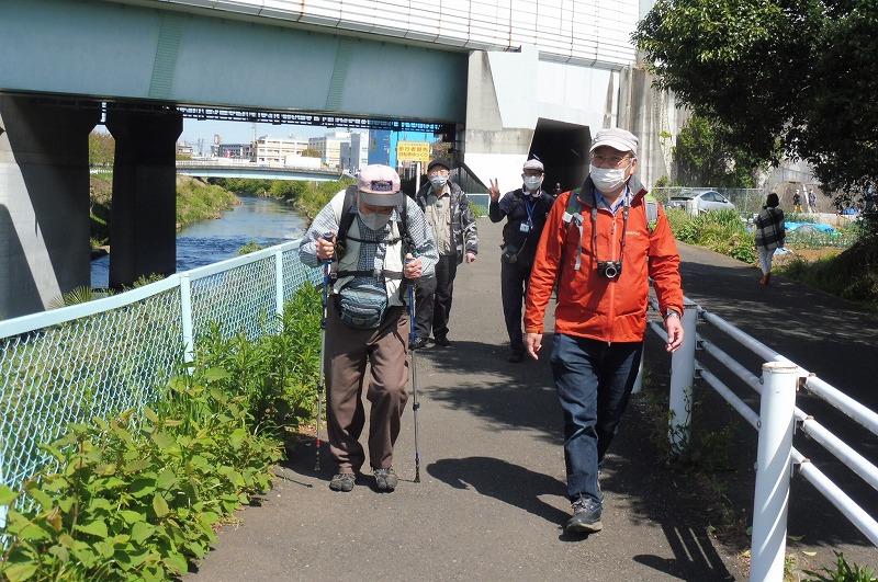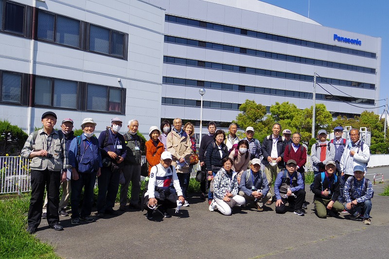 鶴見川の遊歩道を歩き佐江戸公園で休憩。遊歩道に戻りパナソニック佐江戸事業所前で記念写真を撮り、鴨池人道橋を渡り鴨居駅手前で世話役の挨拶を聞いて一次解散。新横浜まで歩くグループと別れました。