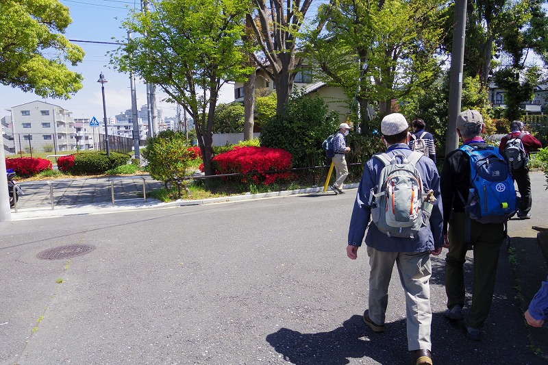 午後の歩きは緑道「ゆうばえのみち」から都田公園、月出松公園の加賀原遺跡、慈恩寺、貝の坂交差点を渡り落合橋へ。