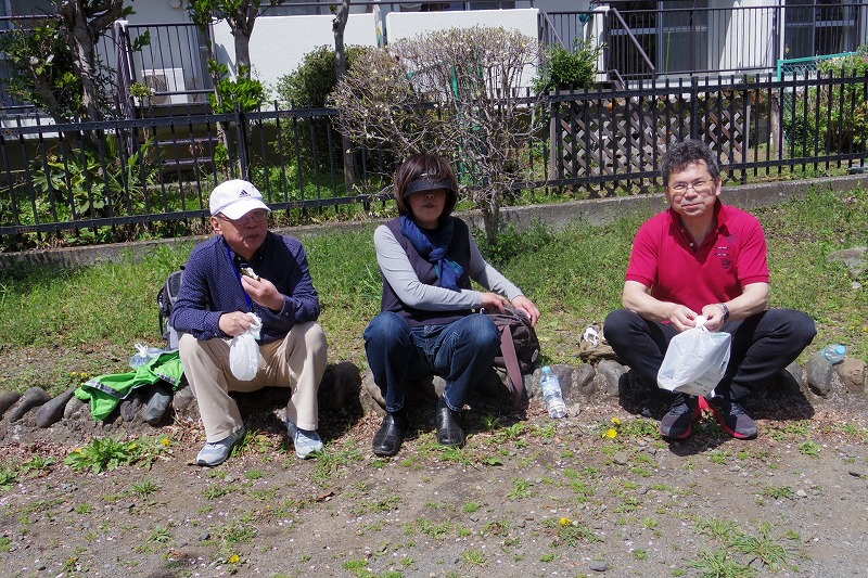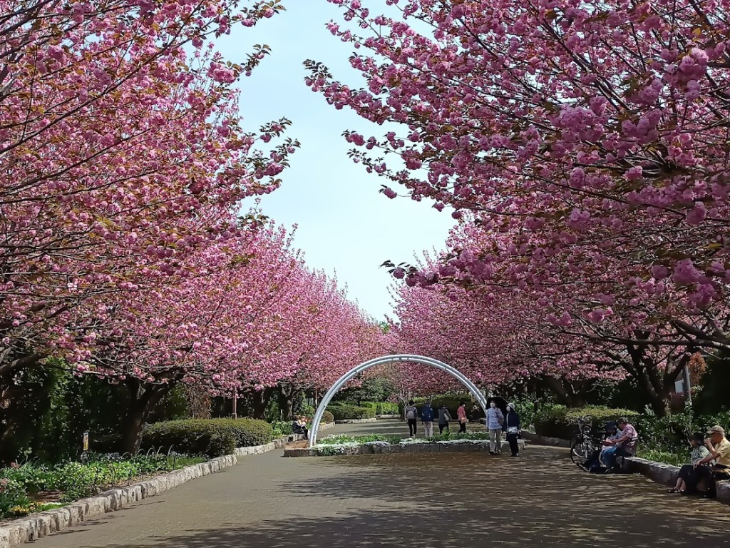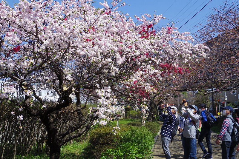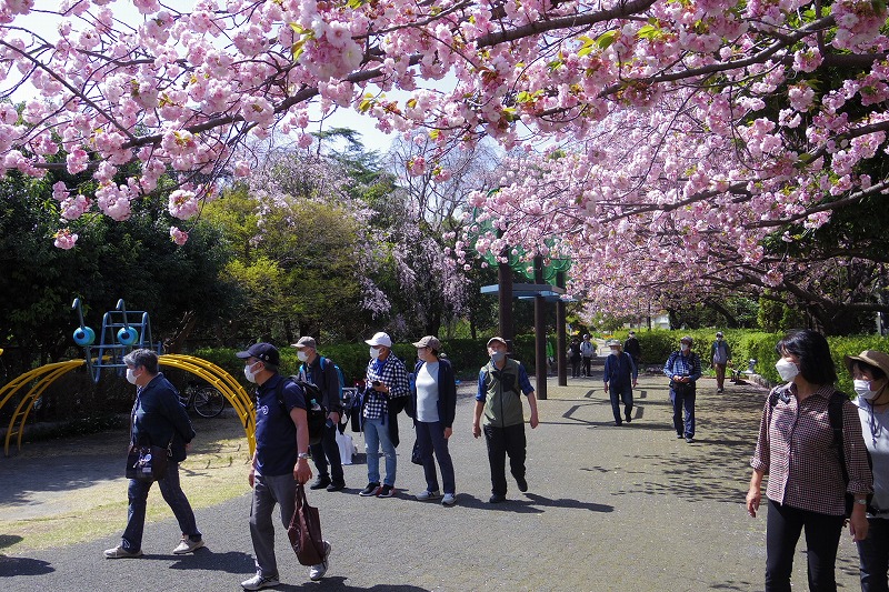 昼食後は緑道に戻り満開の八重桜の下を歩き、さくらの散歩道(さえずりの小道)を歩き、道志川系導水管の仕切弁の実物を見学しながらつきみ野の満開のさくらの散歩道をあるき続けました。もうすぐ満開になる八重桜のアーチの中で記念写真を撮り国道16号線を横断して引き続きさくらの散歩道を楽しみました。境川に到着し、橋を渡って大きな鶴舞公園で休憩。